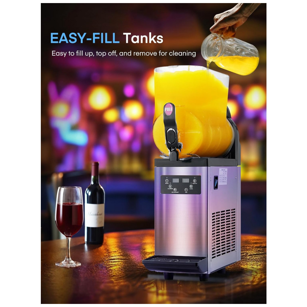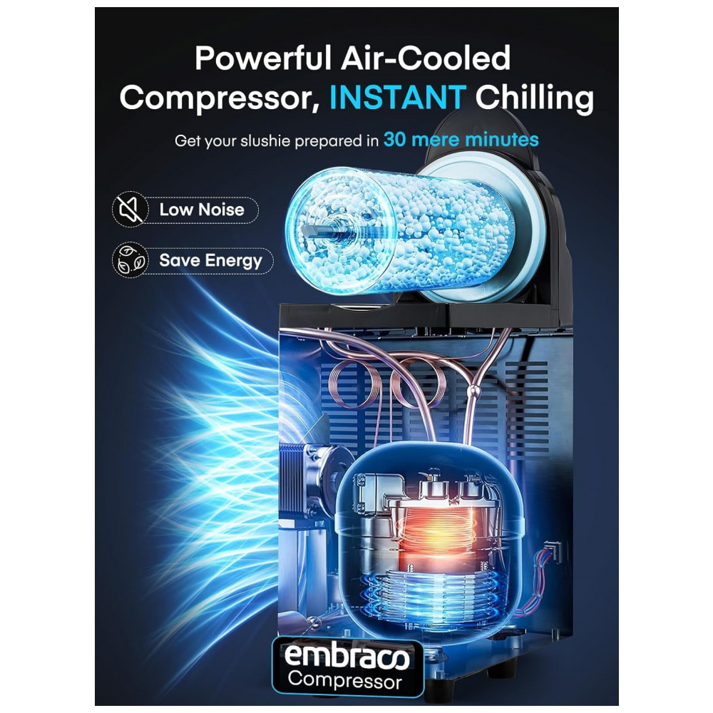 Com tanques de alimentos de 15L cada, esta máquina de frozen comercial produz até 85 copos de 350ml de bebidas por ciclo. As tampas de fácil acesso permitem recargas rápidas, sendo perfeita para ambientes de alto movimento. Controle independente de temperatura para ajustar a consistência do gelo. Permite preparar simultaneamente duas bebidas congeladas distintas. Compressor Embraco premium entrega frozen prontos em 25-30 minutos, até 2x mais rápido que outros compressores. Design do helicoide garante congelamento uniforme e mistura ideal, resultando em bebidas perfeitamente texturizadas. Tanques iluminados por LED destacam suas criações coloridas, aumentando a visibilidade do produto. Ideal para negócios, food trucks, restaurantes e bares.