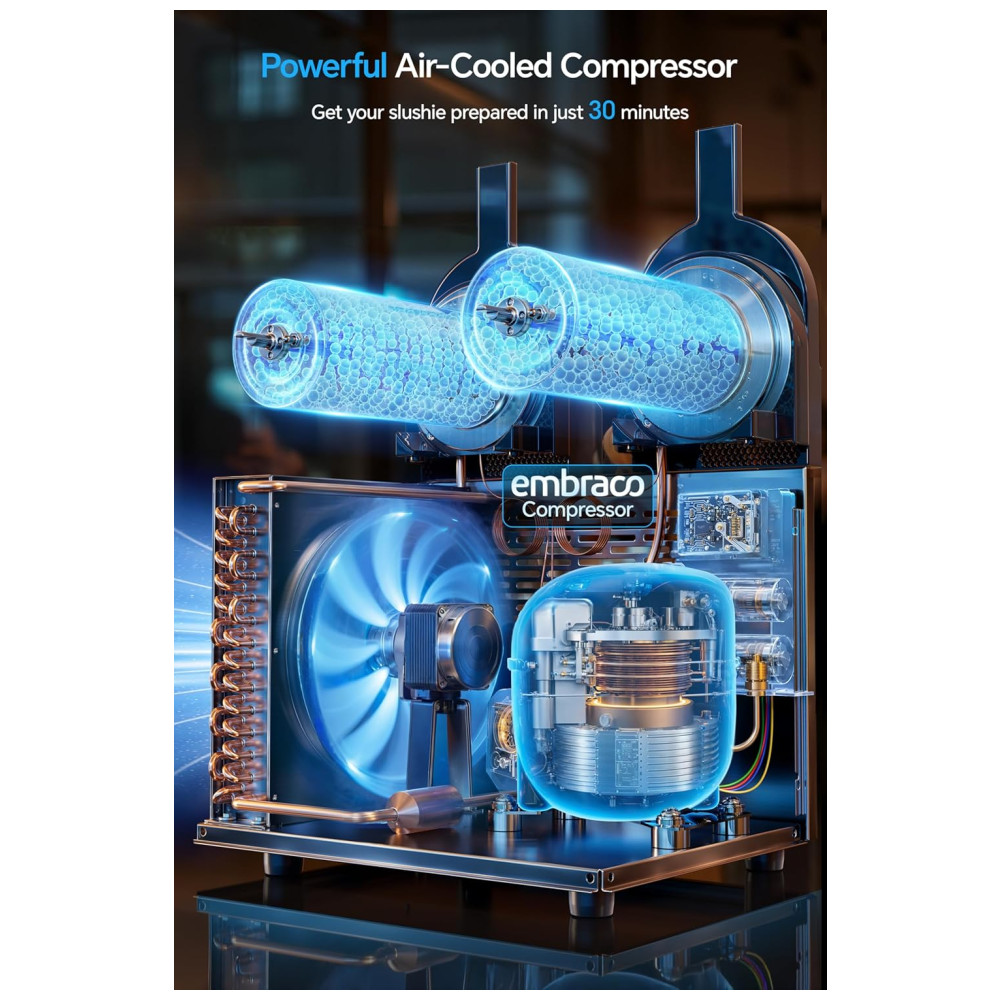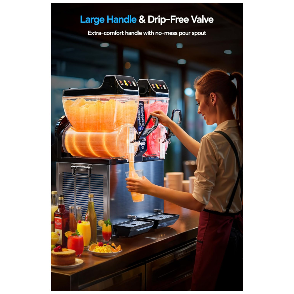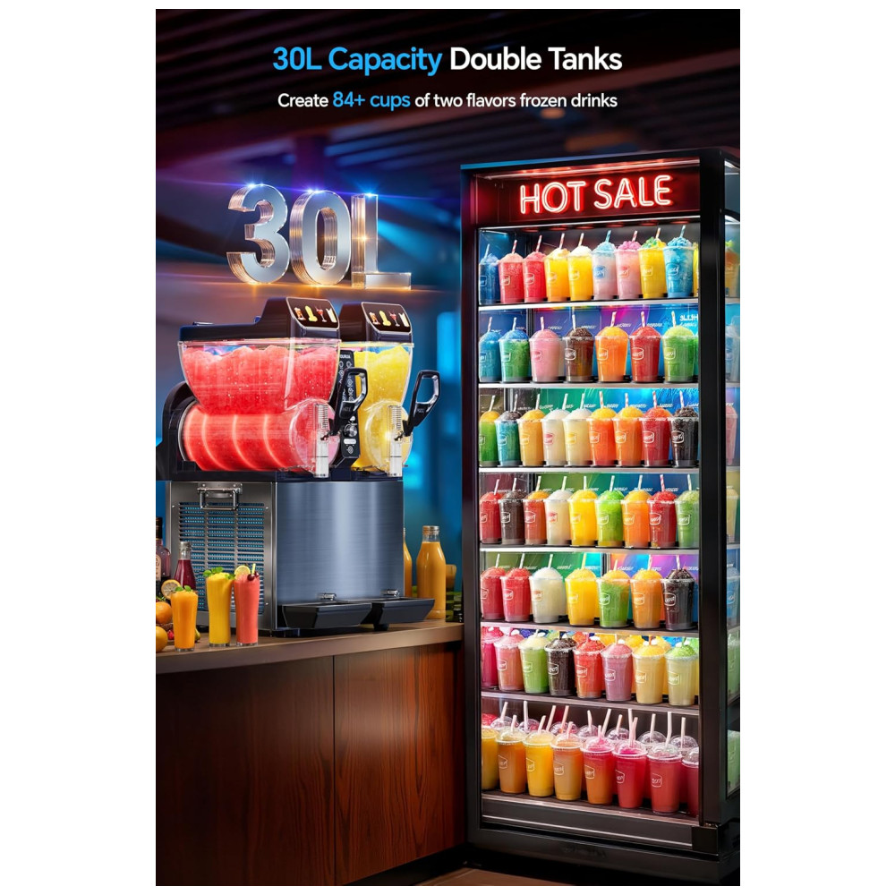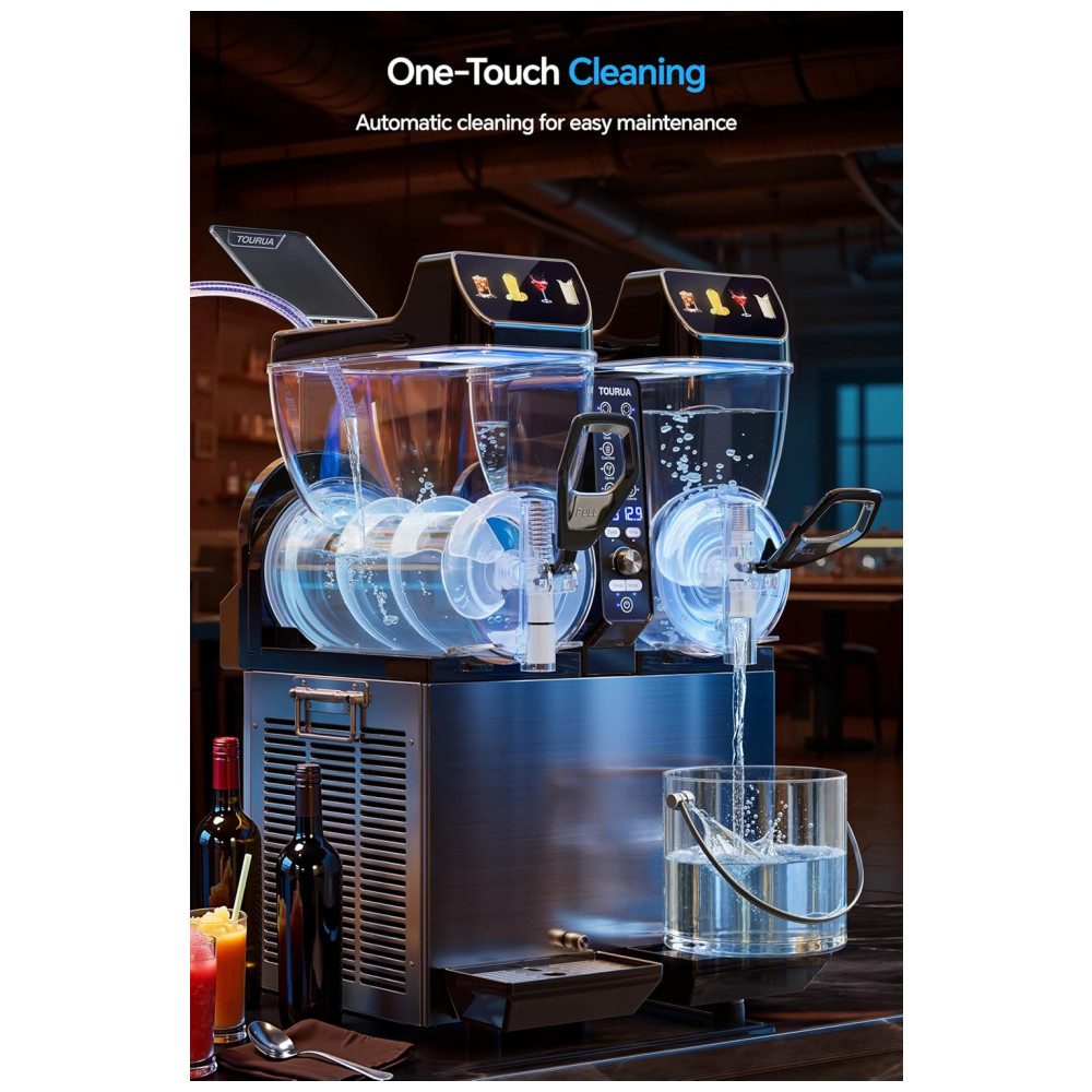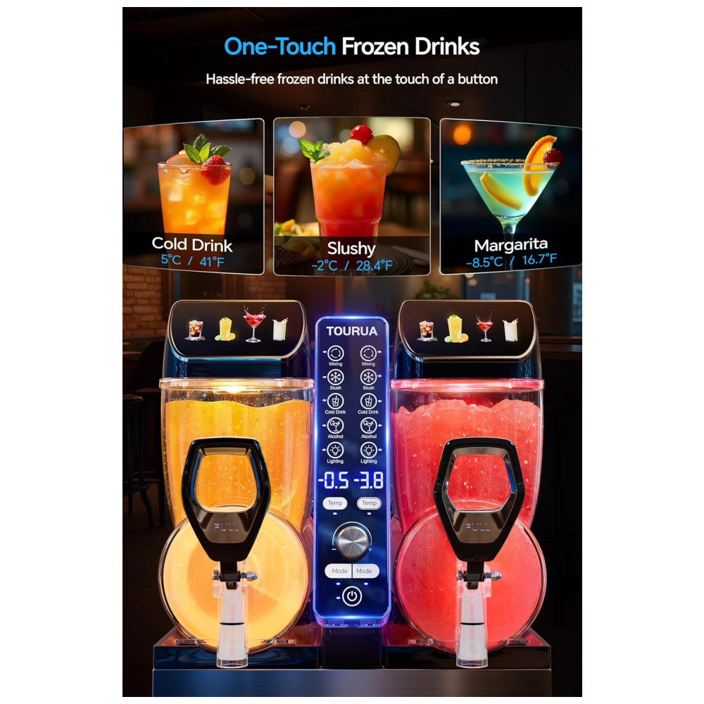 A Máquina de Frozen TOURUA oferece capacidade para 84 porções por abastecimento, com tanques de 30 litros fáceis de encher e seções para recargas rápidas. Com um visual atrativo de LED com 4 cores e ícones de bebidas ajustáveis, ela aumenta a visibilidade e destaca suas bebidas vibrantes. Congela suas bebidas rapidamente em apenas 30 minutos, garantindo um tratamento gelado ideal, graças ao eficiente agitador em torno do cilindro que congela o líquido de forma uniforme. Com 3 programas pré-definidos e um botão de controle de temperatura, você obtém a textura desejada a cada uso. Versátil, é perfeita para criar slushies, sucos congelados, milkshakes, frappés, drinks diferenciados e muito mais, sendo ideal para uso comercial ou em residências grandes.