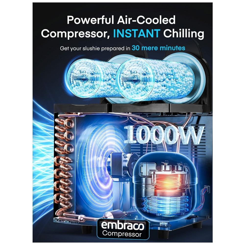 Com tanques de alimentos duplos de 15 litros, esta máquina de frozen comercial produz até 85 copos de 340ml de slushies por ciclo. As tampas superiores de fácil acesso garantem recargas rápidas, sendo perfeita para ambientes de alta demanda como food trucks, estabelecimentos comerciais ou casas grandes. Controle independente da temperatura de cada tanque em uma faixa de precisão de 0 a -9 para ajustar a consistência do gelo, textura e ingredientes. Perfeita para criar duas bebidas congeladas distintas simultaneamente, seja frappes super cremosos ou slushies com cristais crocantes. Equipada com um compressor Embraco premium, esta máquina de margaritas comercial entrega slushies prontos para servir em apenas 25-30 minutos, até 2x mais rápido que compressores genéricos, mantendo uma operação ultra eficiente. O design do helicóptero garante congelamento uniforme e mistura ideal, garantindo bebidas com textura perfeita lote após lote. Os tanques vibrantes com LED mostram suas criações coloridas, aumentando a visibilidade do produto para cativar clientes e impulsionar compras por impulso. A máquina de bebidas congeladas perfeita para estabelecimentos comerciais, food trucks, restaurantes, bares, etc.