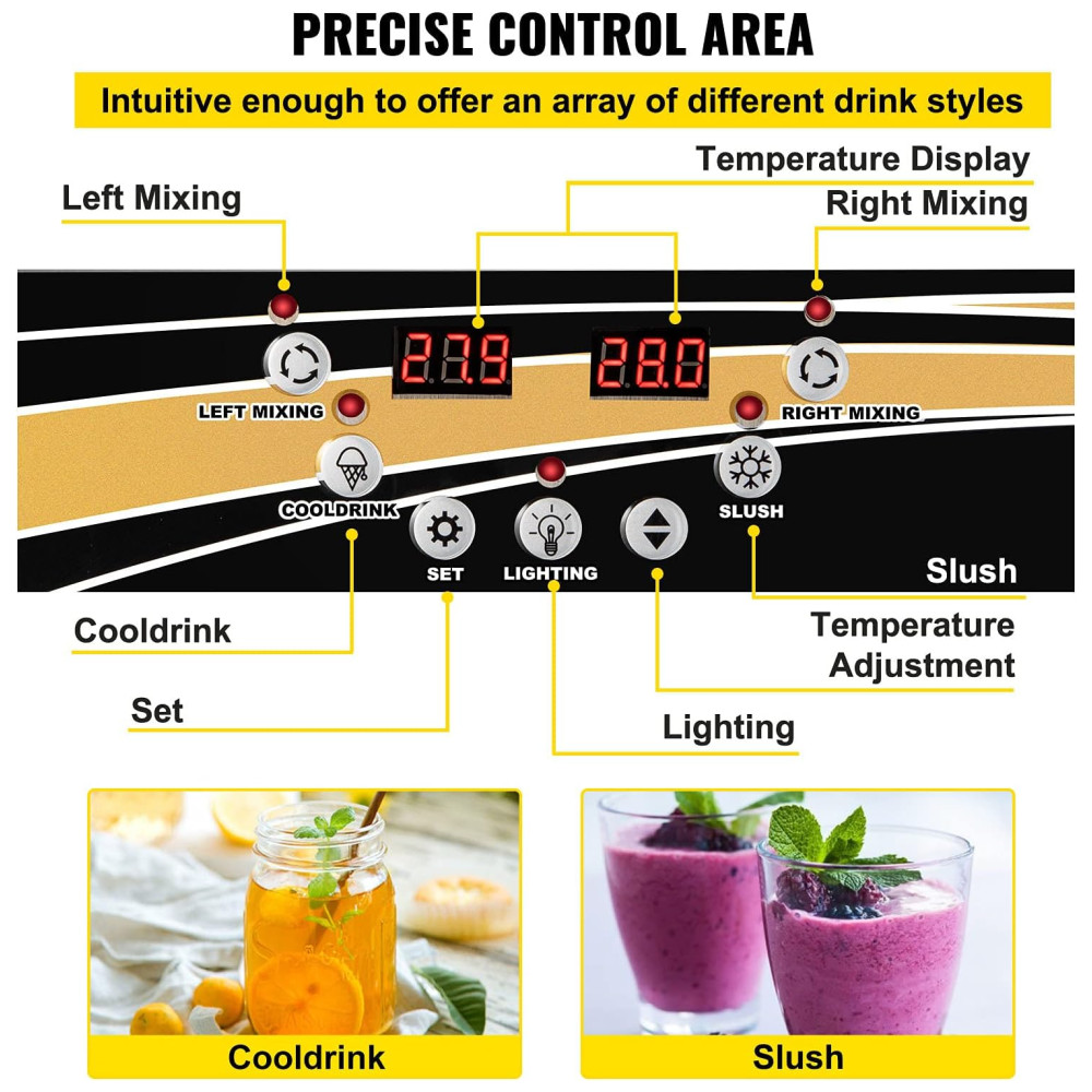 Enfrente o calor deste verão e sirva deliciosos frozen o ano todo com a Máquina de Frozen comercial da VEVOR. Com dois tanques de 15 litros cada, você pode preparar e servir uma grande quantidade de bebidas simultaneamente. A iluminação interna destaca suas bebidas, trazendo praticidade para operações noturnas. Feita com aço inoxidável espesso e tanques de policarbonato de qualidade alimentar, esta máquina é durável, fácil de limpar e manter. O sistema de refrigeração de alto desempenho garante produção eficiente de frozen, permitindo a criação de diversas bebidas geladas. O painel de controle preciso, com tela digital, facilita a operação, enquanto os modos COOL DRINK e SLUSH oferecem versatilidade. Projetada com bandejas de gotejamento, torneiras e pés antiderrapantes, esta máquina é perfeita para você.
