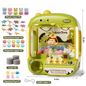 Itens inclusos: Máquina de Garra Dinossauro x1, Brinquedos de pelúcia x10, Dinossauros de brinquedo x14, Ovos surpresas x10, Brinquedos squishy x6, Moedas x24, Cartões de fundo temáticos x5, Cabo USB x1, Chave de fenda x1