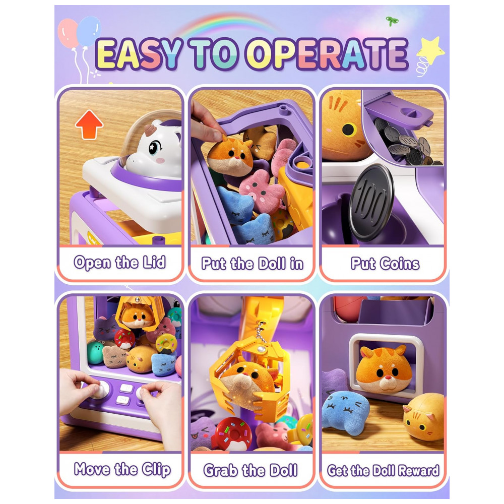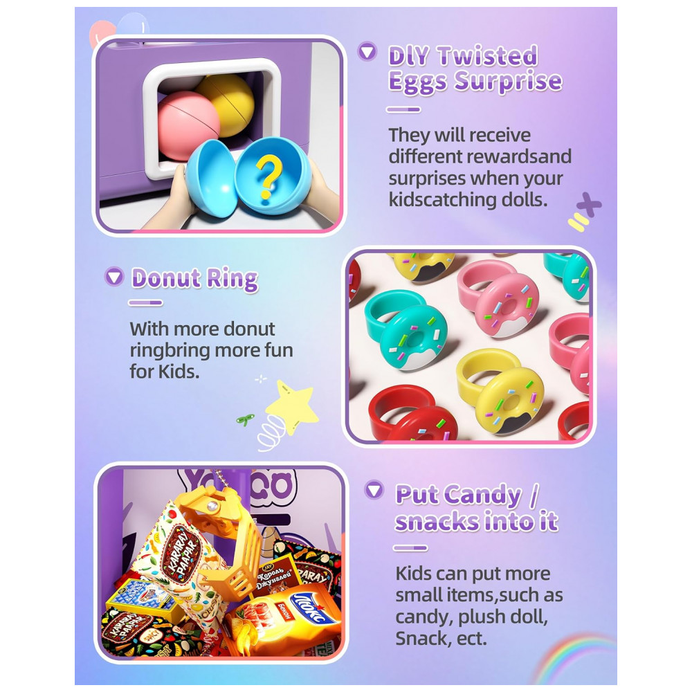 Conteúdo da caixa: Máquina de garra, 30 brindes (10 pelúcias, 10 ovos surpresa, 10 mini donuts), cabeça removível, manual do usuário