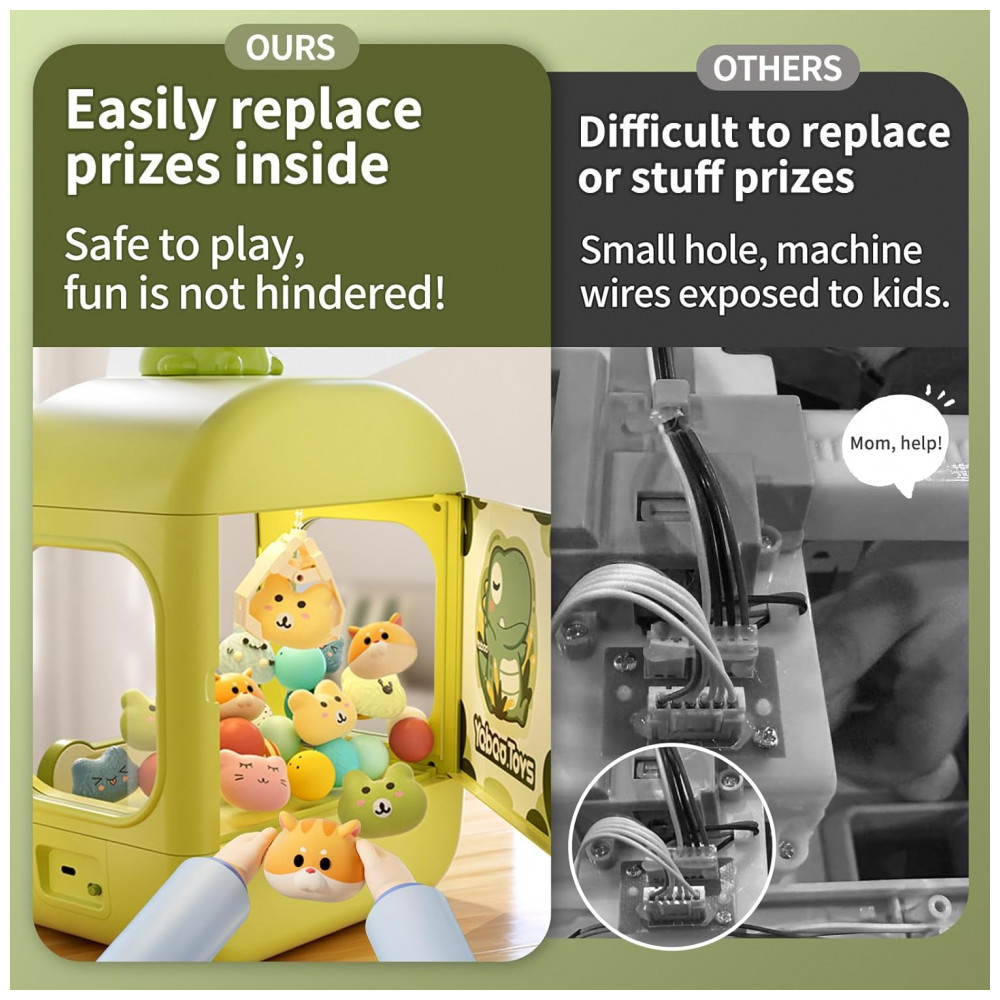A máquina de garra para crianças ORANGE OCEAN estilo Dinossauro oferece diversão em nível arcade dentro de casa. Com mais de 60 peças de prêmios — incluindo bonecos de pelúcia, brinquedos de apertar, ovos‑surpresa e doces — esta máquina proporciona emoção e surpresa a cada jogada. O compartimento amplo permite que as crianças também adicionem seus próprios mini‑brinquedos ou lanchinhos, tornando a brincadeira ainda mais versátil.