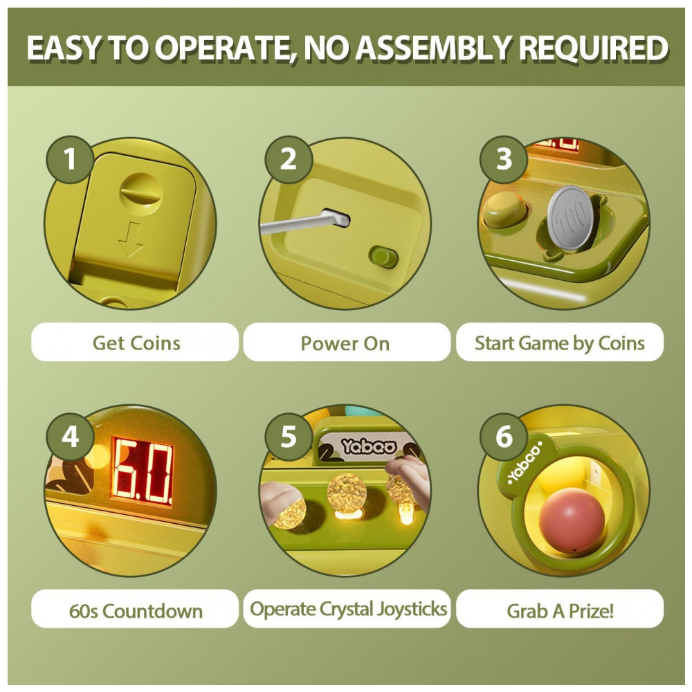 O funcionamento é intuitivo: luzes pisca‑pisca e sons de fliperama criam uma atmosfera arcade autêntica, o joystick permite movimentar a garra com facilidade, e a energia pode ser fornecida via cabo USB ou 4 pilhas AA (não inclusas), ideal para festas, eventos ou lazer em família.