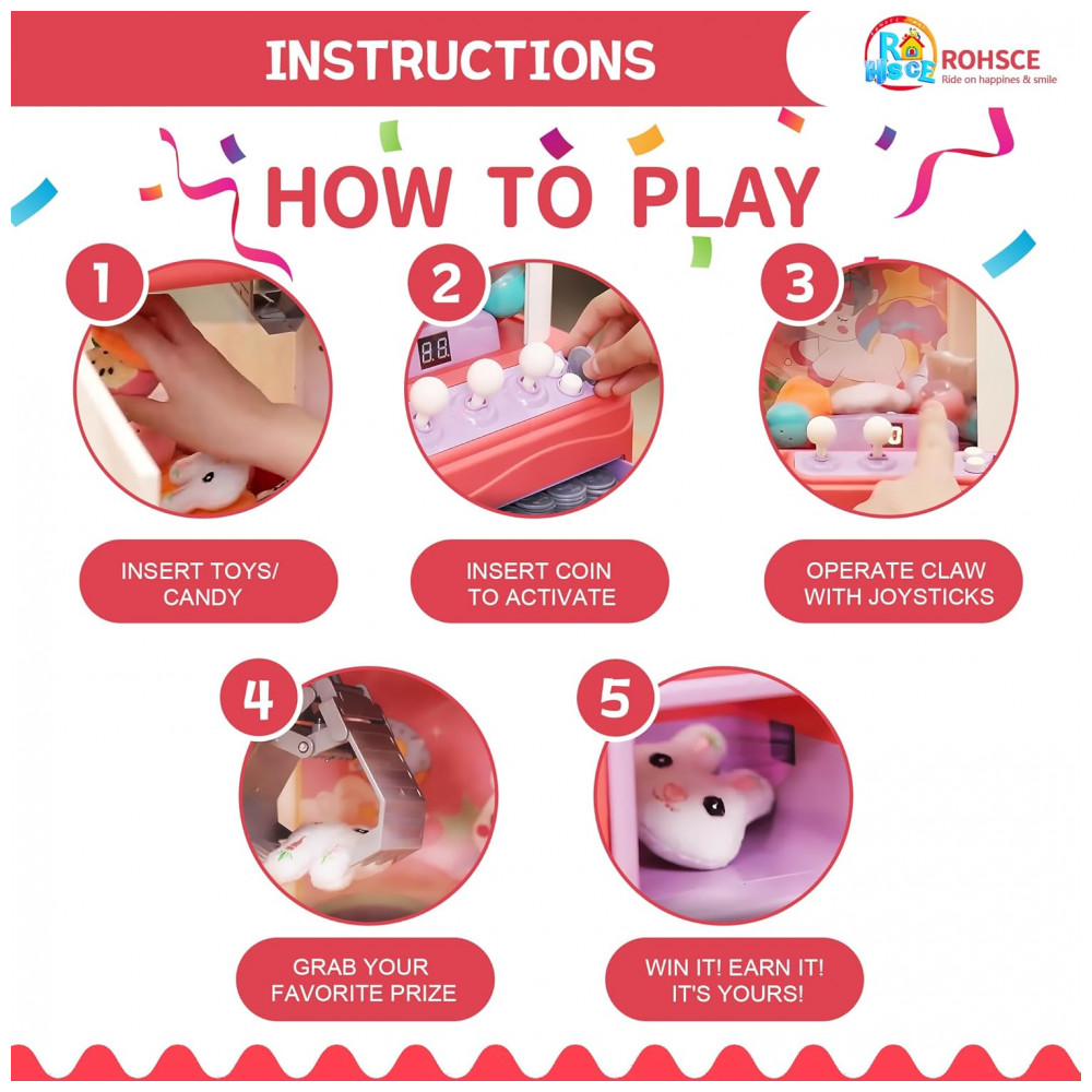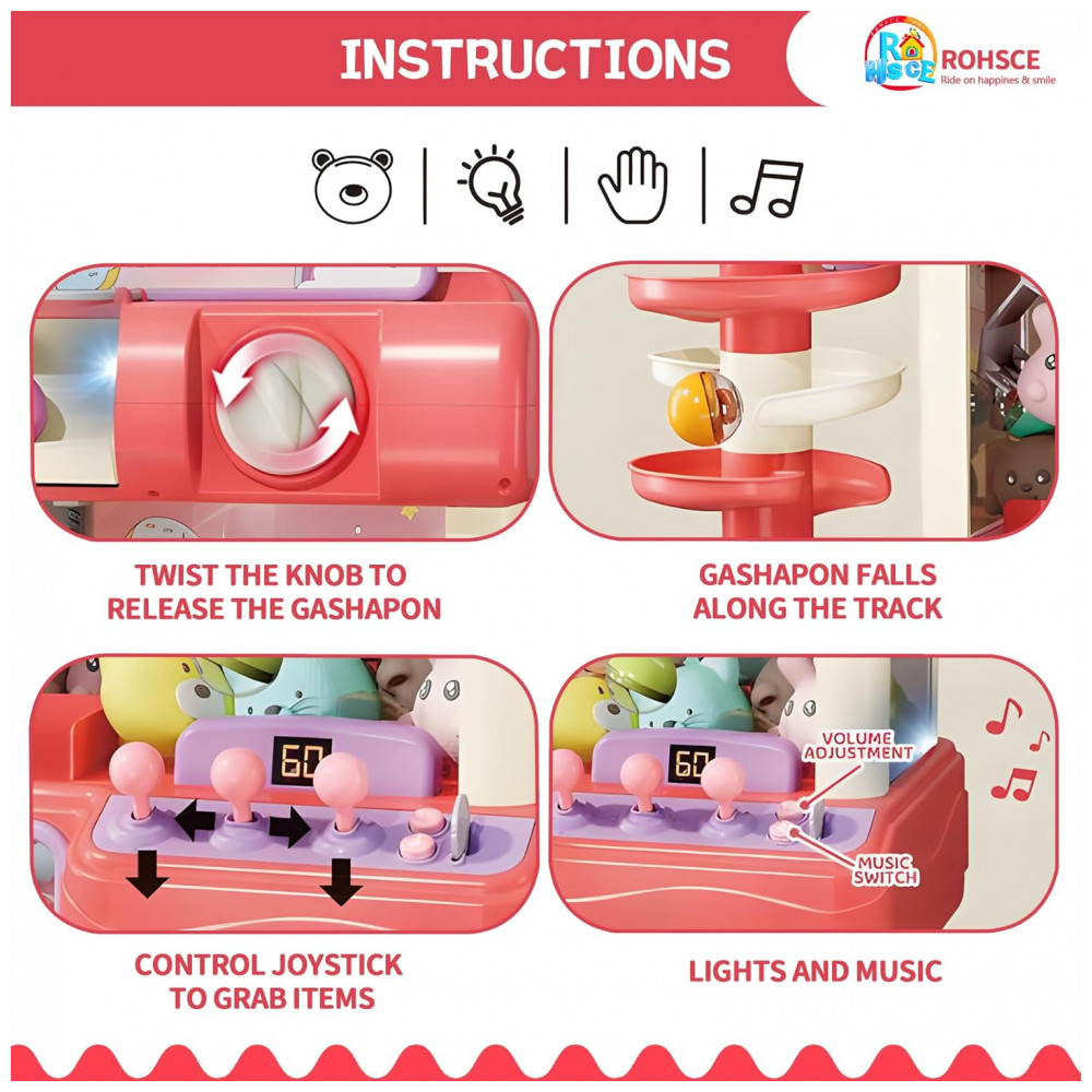 Conteúdo da embalagem: Máquina de Garra, 6 bonequinhos de pano, 10 cápsulas com brinquedos, cabo USB