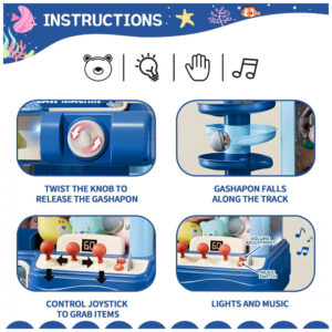 Itens inclusos: Máquina de garra, 6 mini bonecos de pano, 10 cápsulas com brinquedos, cabo USB