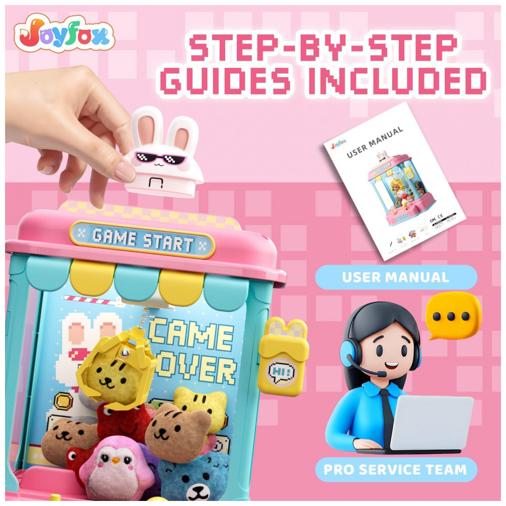 Máquina de Garra Rosa e Azul JoyfoxToy – Mini Arcade Infantil com 10 Pelúcias 10 Cápsulas Som e Brinquedos