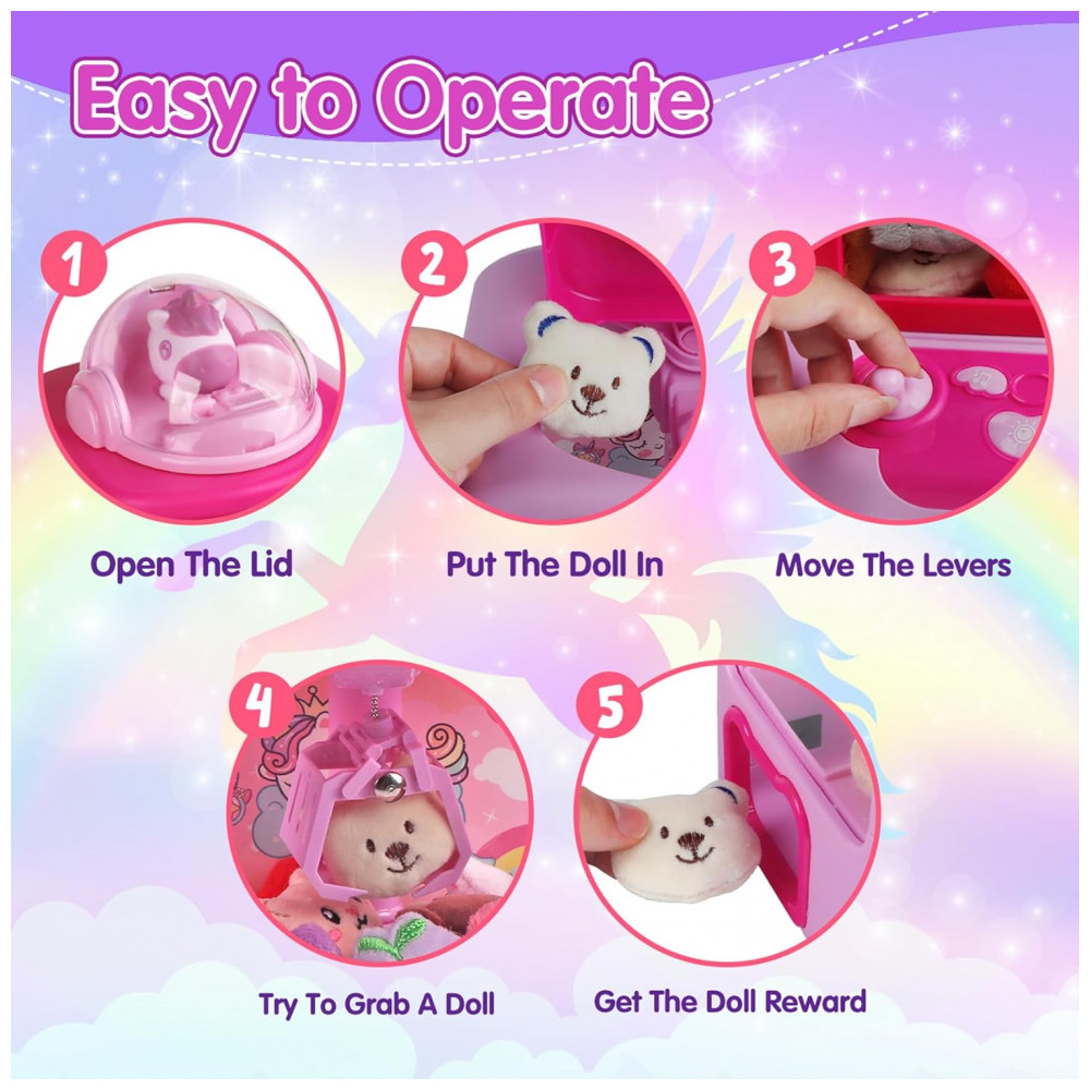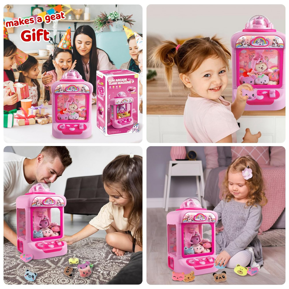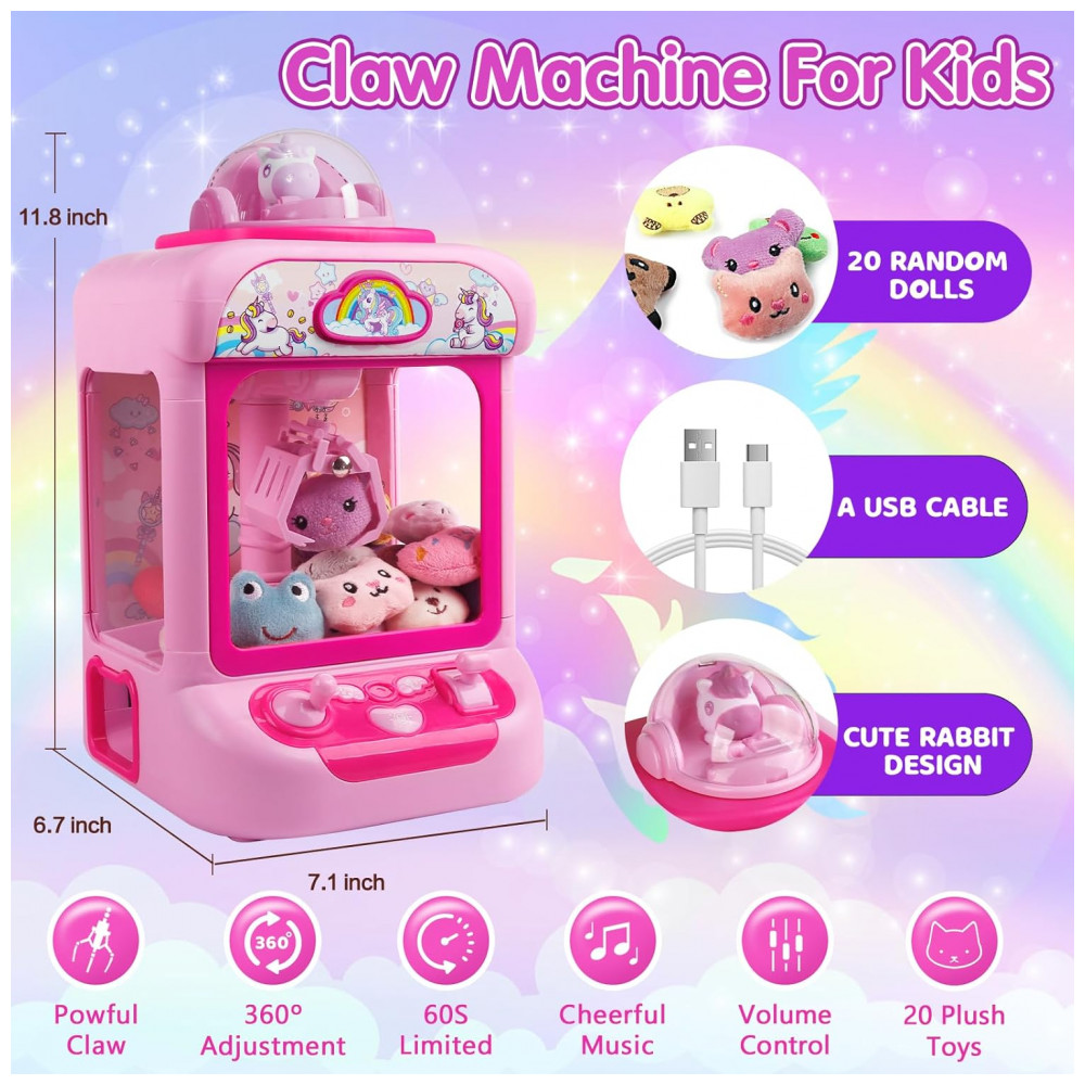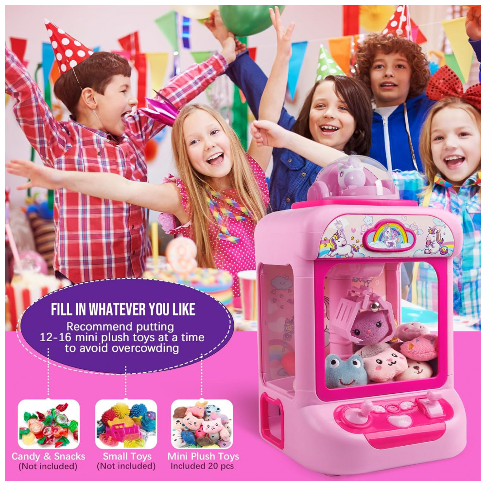 Máquina de Garra Unicornio TingingYuli Rosa Mini Arcade Eletrônica com 20 Pelúcias e Dispensador de Doces para Crianças