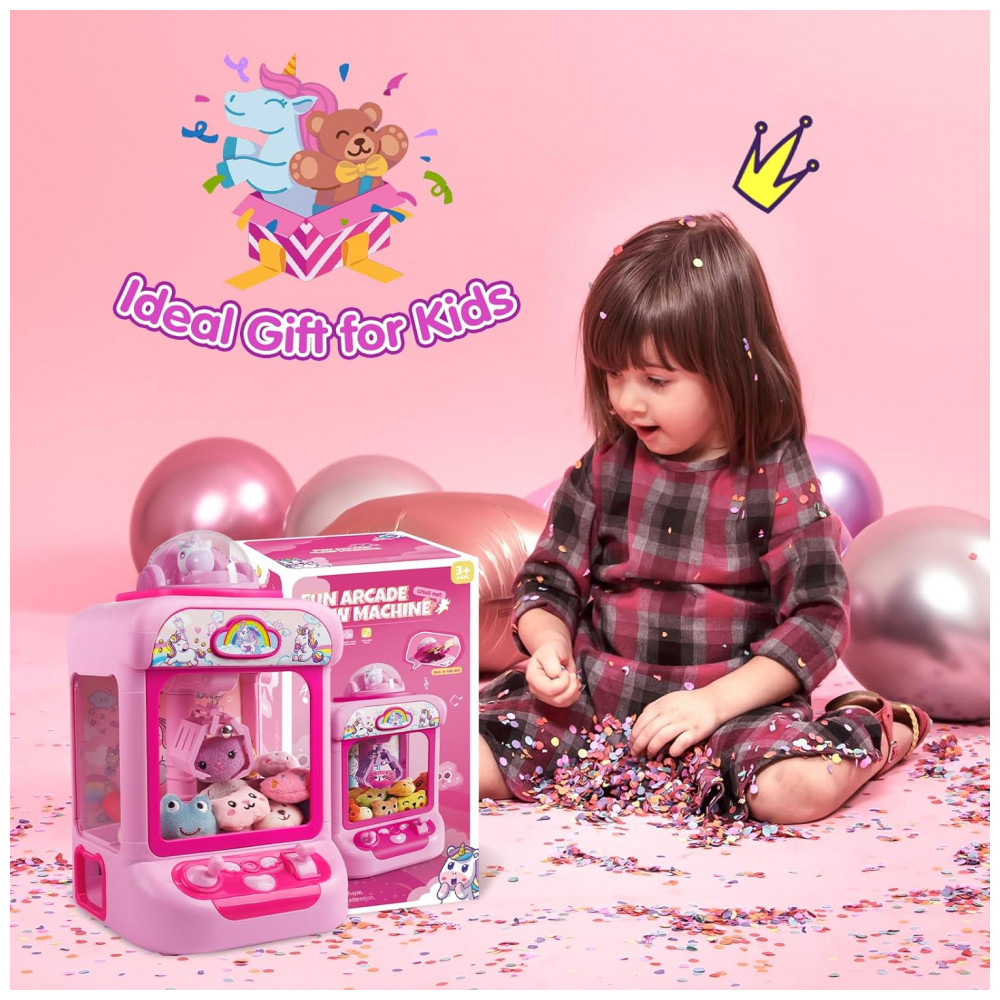 Máquina de Garra Unicornio TingingYuli Rosa Mini Arcade Eletrônica com 20 Pelúcias e Dispensador de Doces para Crianças