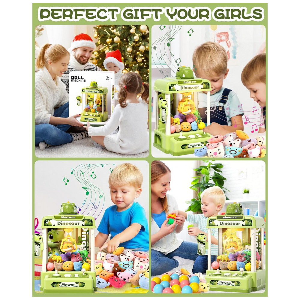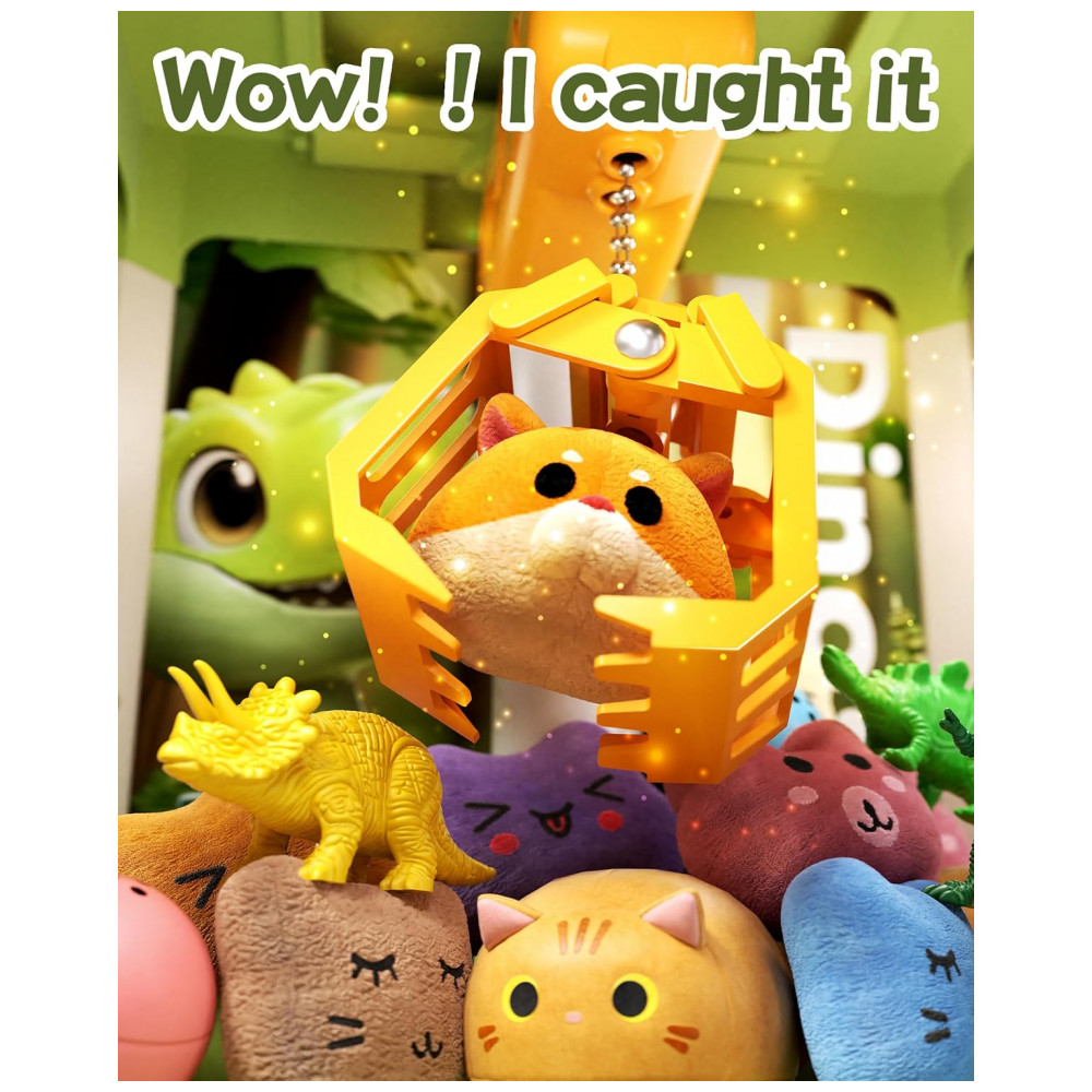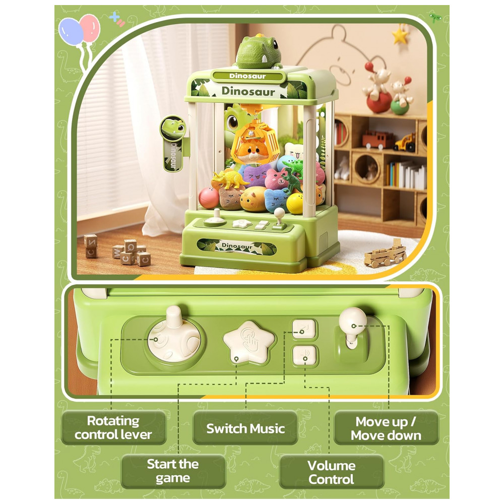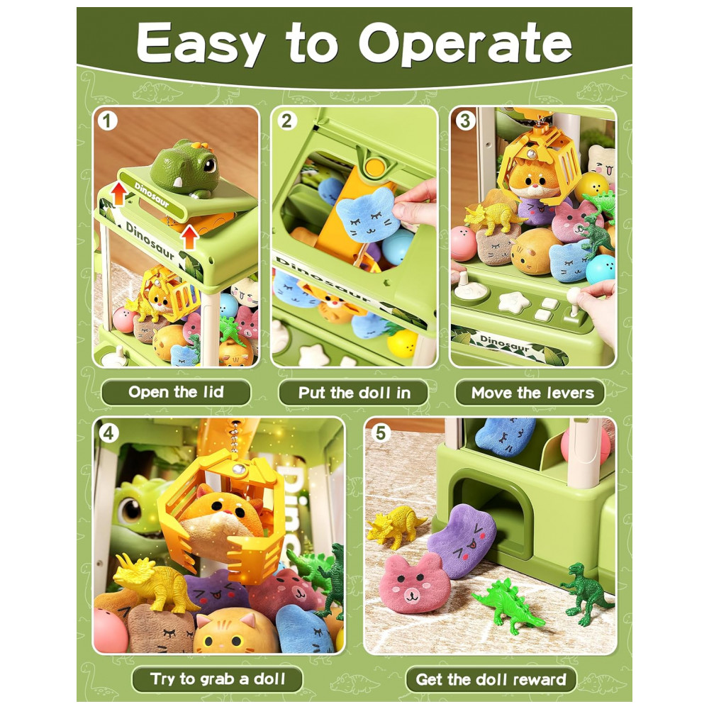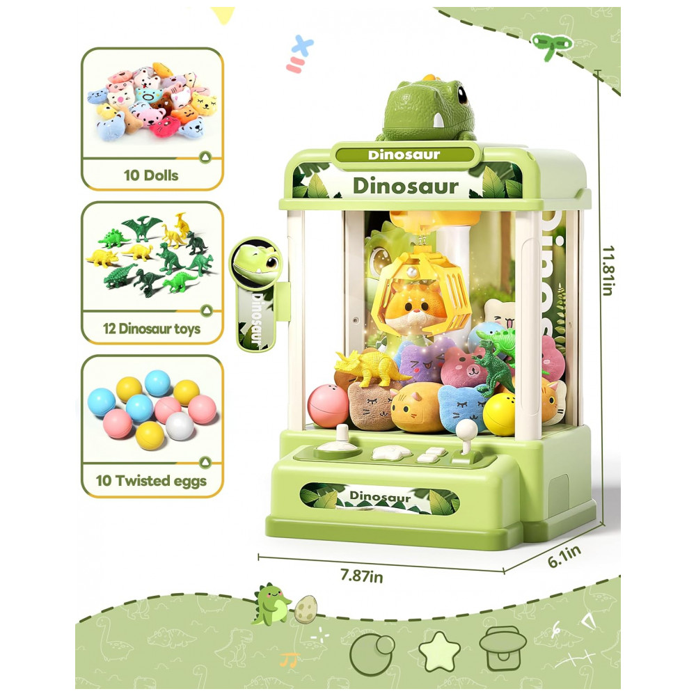 Itens inclusos: 1 máquina de garra, 20 brinquedos aleatórios, 12 acessórios de dinossauro, manual de instruções