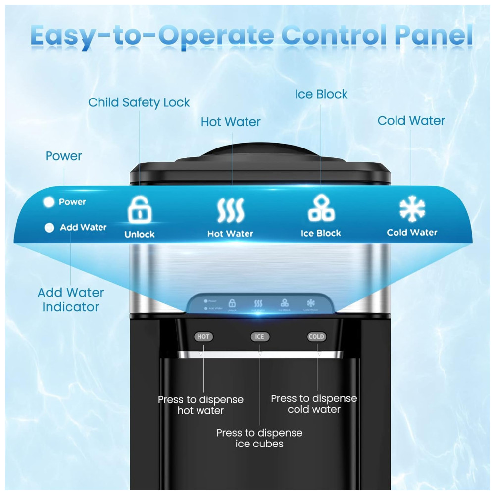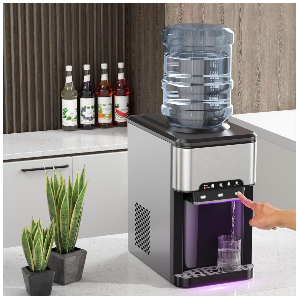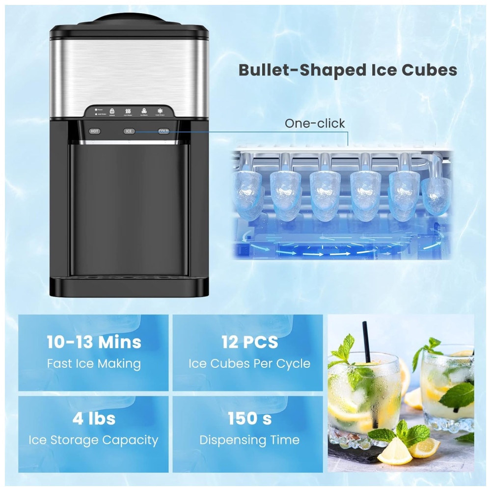 Máquina de Gelo 3 em 1: Dispensador de Água e Gelo: Nosso dispensador de água de bancada oferece 3 opções de temperatura: água quente (≥90°C), água fria (≤8°C) e cubos de gelo fresquinhos, de acordo com a sua necessidade. Ele pode produzir 12 cubos de gelo em forma de bala por ciclo em apenas 10-13 minutos, garantindo praticidade e rapidez para o seu dia a dia.