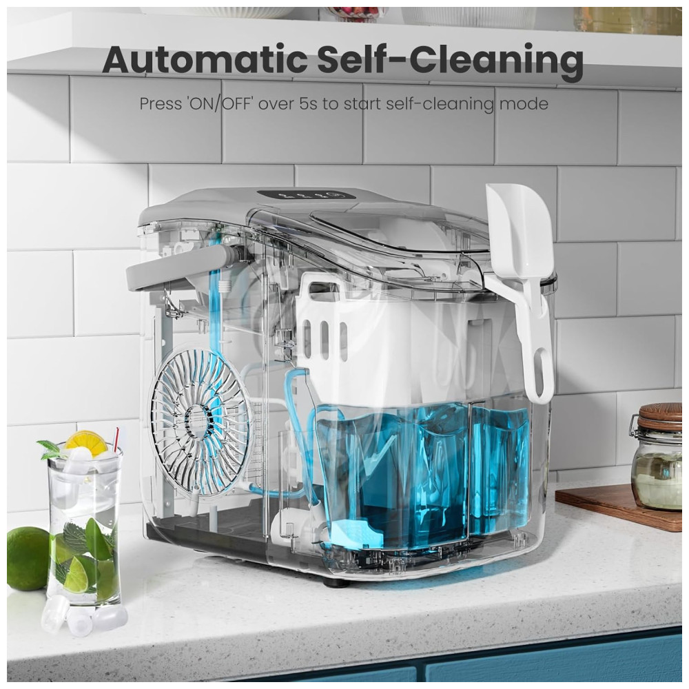 Autolimpeza A máquina de fazer gelo portátil AGLUCKY vem com uma função avançada de autolimpeza, basta pressionar o botão On, Off por cinco segundos após adicionar água para operar o modo de autolimpeza. A máquina de limpeza periódica ajuda a remover as substâncias nocivas e prolongar a vida útil da máquina.