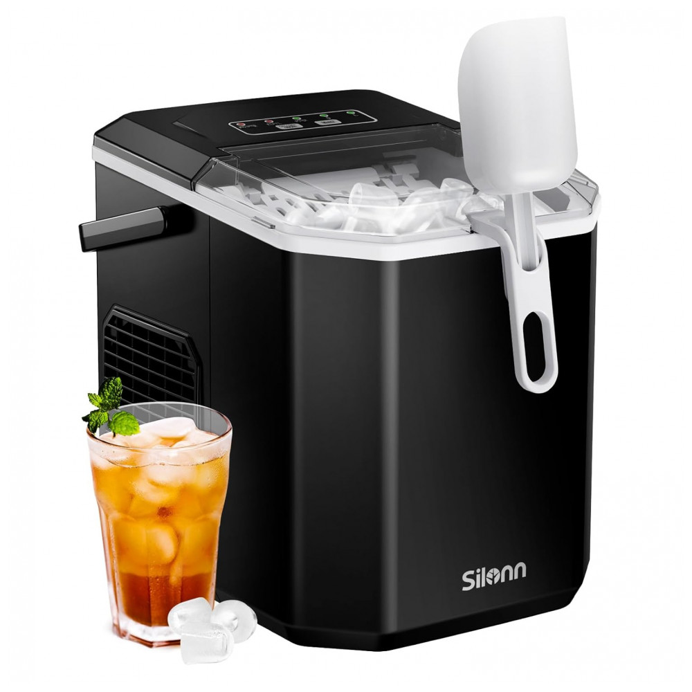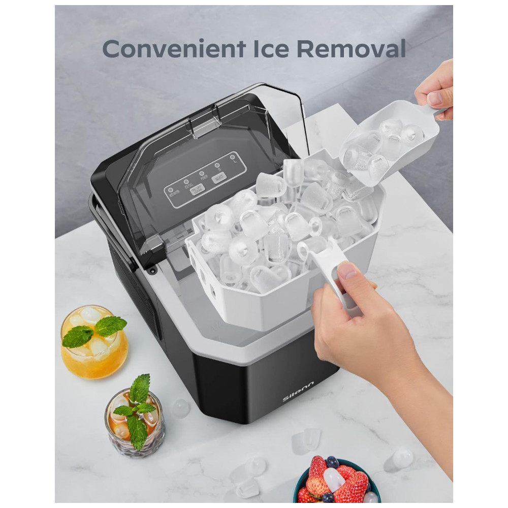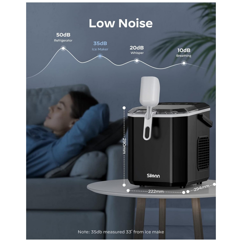 TAMANHO COMPACTO PERFEITO Medindo apenas 22,1 x 29 x 29,5 centímetros de tamanho, a máquina de fazer gelo Silonn pode caber facilmente em um balcão, ilha de cozinha ou mesa sem ocupar muito espaço. Graças ao design de baixo ruído de 35 dB, você pode operar a máquina sem distrações barulhentas.