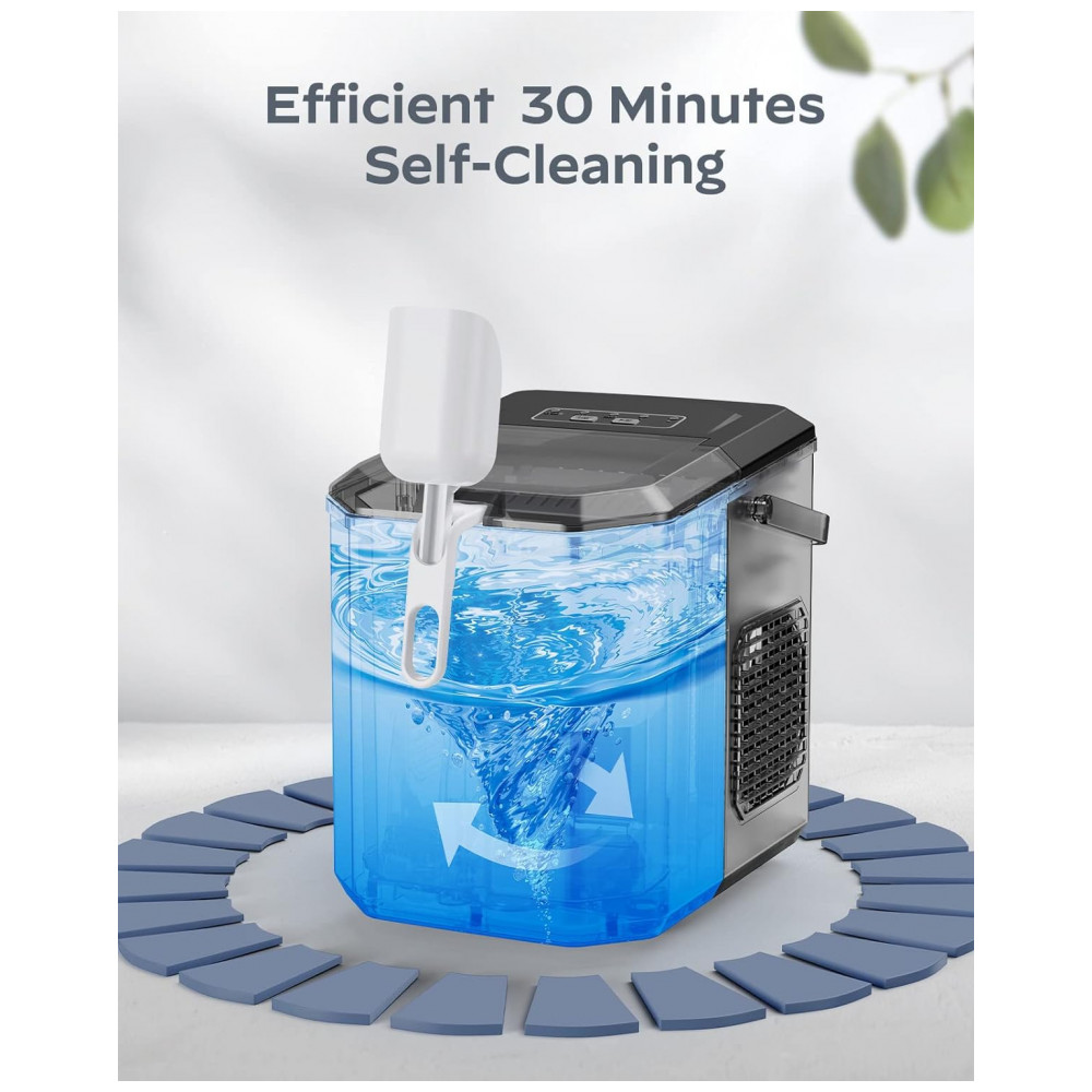 FUNÇÃO DE AUTOLIMPEZA Mantenha seu gelo fresco e limpo com a função de autolimpeza automática. Simplesmente remova a cesta, adicione água e segure o botão CLEAN por 5 segundos para ativar. Após 30 minutos, você estará pronto para fazer um lote