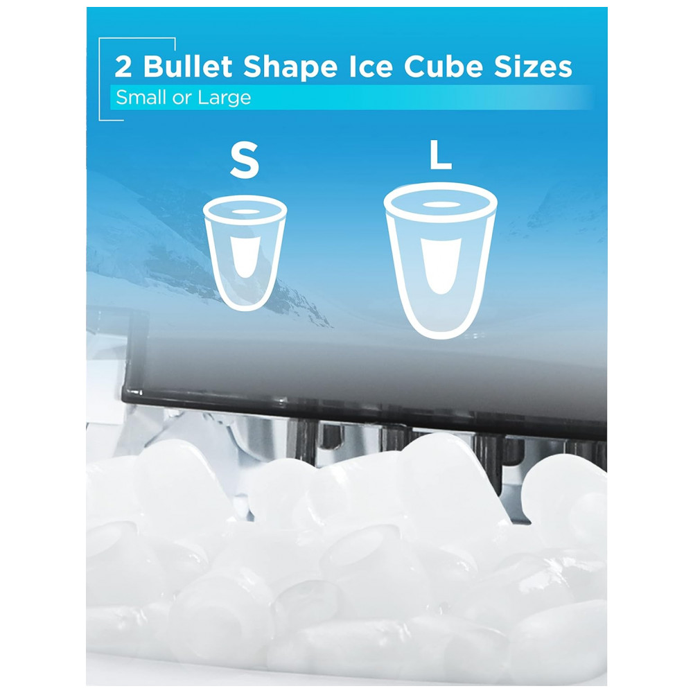 ALTA CAPACIDADE Nossa máquina de gelo portátil 7,25 kg tem um reservatório de água de 2 litros 0,52 galões e capacidade de zenamento de gelo de 1,5 libras 0,68 kg. Cubos feitos na hora esperam por você e seus convidados.