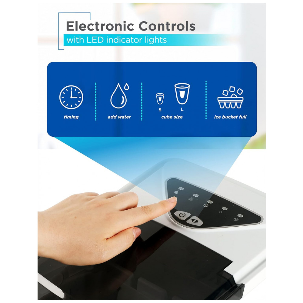 FUNCIONALIDADE IMPRESSIONANTE Esta máquina de fazer gelo tem um controle eletrônico LED fácil de navegar com uma luz indicadora de gelo cheio, bem como uma luz indicadora de falta de água.