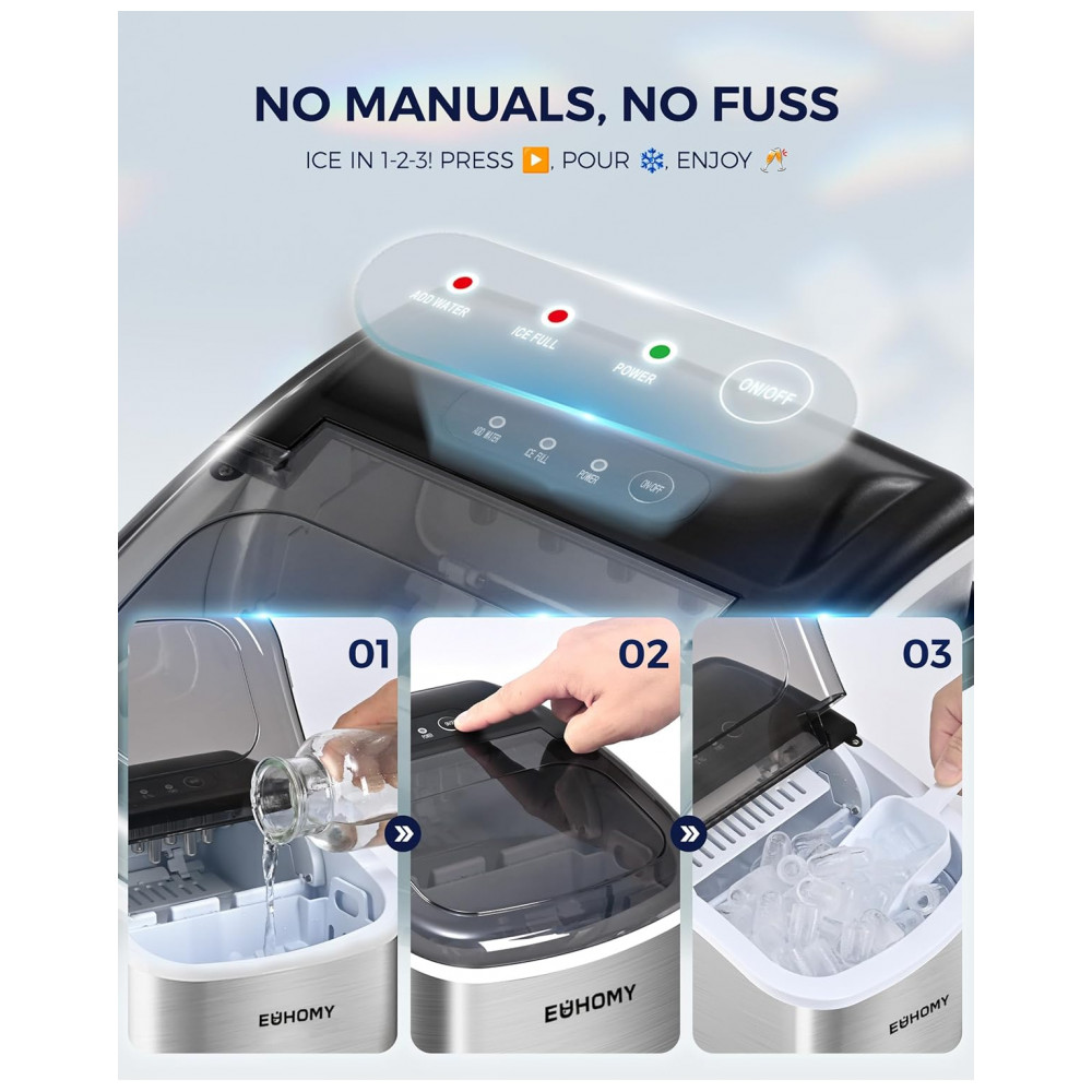 Fácil de usar e operação simples O fabricante de gelo Euhomy adota um design visualizado por uma grande janela transparente, permitindo a visualização do interior da fabricação de gelo. Equipado com um compressor atualizado de 170W que consome cerca de 4 kWh, 24 horas de energia para economizar em suas contas de eletricidade. E com um painel de controle de fácil operação para uma operação mais rápida em apenas duas etapas, adicionando água e pressionando ON, OFF. Então, nosso fabricante de gelo fornecerá gelo fresco para você e seus familiares em tempo hábil