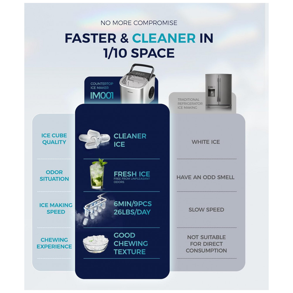 Operação inteligente e autolimpeza a máquina de fazer gelo possui um sensor infravermelho avançado. O indicador ICE FULL pisca para lembrar que você deve retirar o gelo para evitar transbordamentos quando a cesta estiver cheia. E vai lembrá lo de adicionar água piscando ADD WATER. Além disso, a máquina de fazer gelo compacta possui uma função de limpeza automática com um toque. Pressione o botão ON, OFF por 5 segundos após adicionar água para executar o modo automático por 30 minutos. Além de ter as mãos livres, você também obtém uma máquina de fazer gelo limpa.