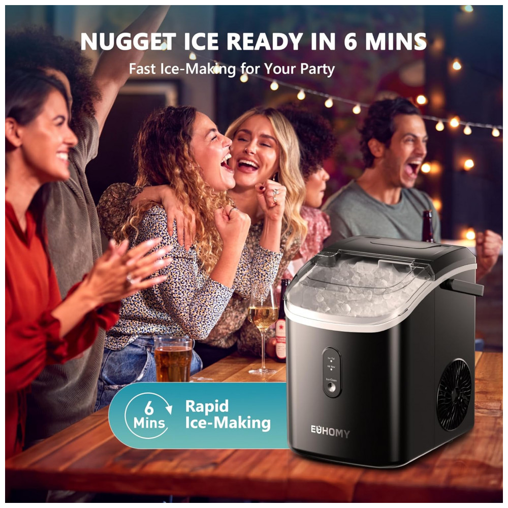 6 MINUTOS DE FABRICAÇÃO DE GELO E GELO DE PEPITA Satisfaça sua sede rapidamente com o eficiente Fabricante de Gelo de Pepitas EUHOMY Você pode desfrutar de gelo de pepita fresco e bebidas geladas em 6 a 8 minutos. Com um tanque de água de 1,1 litros, ele produz facilmente até 15 kg de gelo por dia e tem uma cesta removível de aproximadamente 0,8 kg. O gelo de pepita macio e crocante exclusivo não machuca suas mãos ou boca e resfria as bebidas rapidamente, preservando seu sabor e proporcionando uma experiência agradável de mastigação. É perfeito para coquetéis, smoothies e outras bebidas.