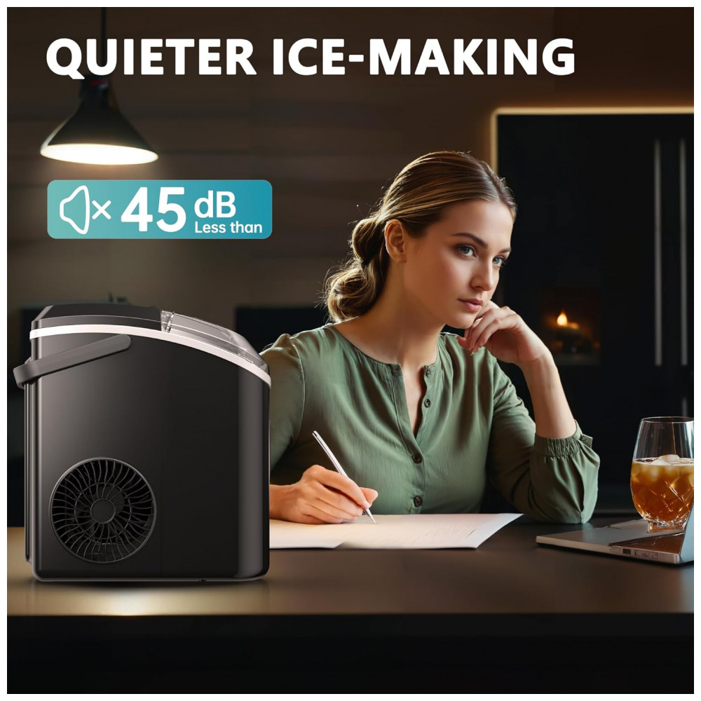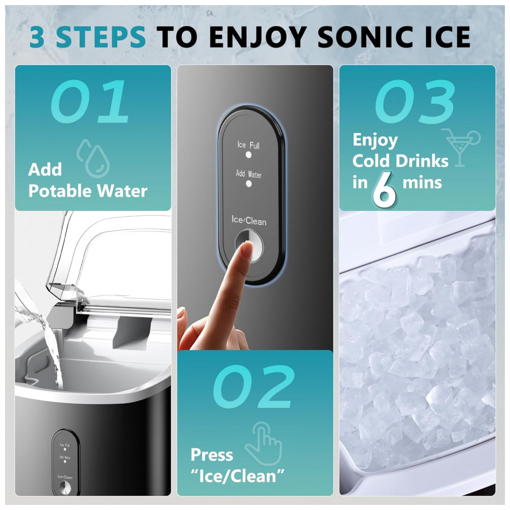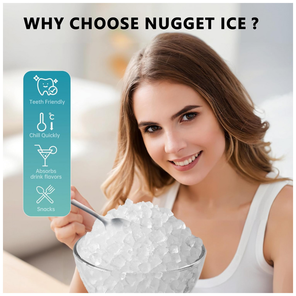 MAIS SILENCIOSO, ECONÔMICO EM ENERGIA E ECO FRIENDLY Nosso fabricante de gelo de pepitas de bancada é excelente em refrigeração, operando com menos de 50 decibéis de ruído, garantindo um ambiente confortável e silencioso para trabalhar ou dormir. Com seu baixo consumo de energia de aproximadamente 1 kWh, 8 horas, você economizará mais na conta de luz enquanto desfruta de bebidas refrescantes. Ao escolher nossa máquina de fazer gelo ecológica, você também estará fazendo um impacto positivo no meio ambiente. Impressionar seus convidados antes mesmo de eles experimentarem o delicioso gelo de pepita