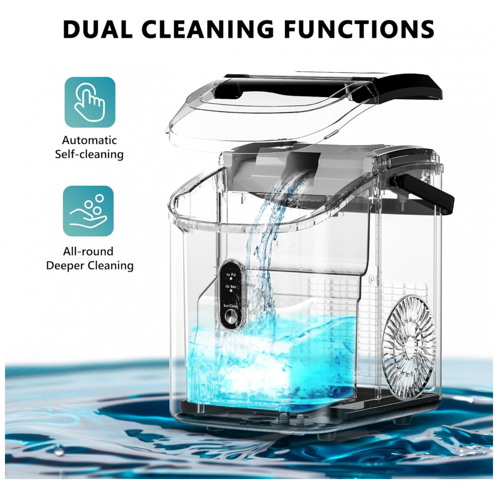 INTELIGENTE E AUTO LIMPEZA Ao contrário de outros fabricantes de gelo que seguem ciclos de envelhecimento internos, o fabricante de gelo de pepitas EUHOMY apresenta o indicador ICE FULL para interromper a produção de gelo e lembrá lo de remover o gelo. O aviso ADD WATER alertará você para adicionar água. O fabricante de gelo de pepitas executará uma autolimpeza de 15 minutos com um simples toque no botão ON, OFF por 3 segundos após adicionar água. A tampa superior também pode ser facilmente levantada para uma limpeza mais completa. Nosso design de limpeza dupla oferece uma experiência de fabricação de gelo limpa e segura.