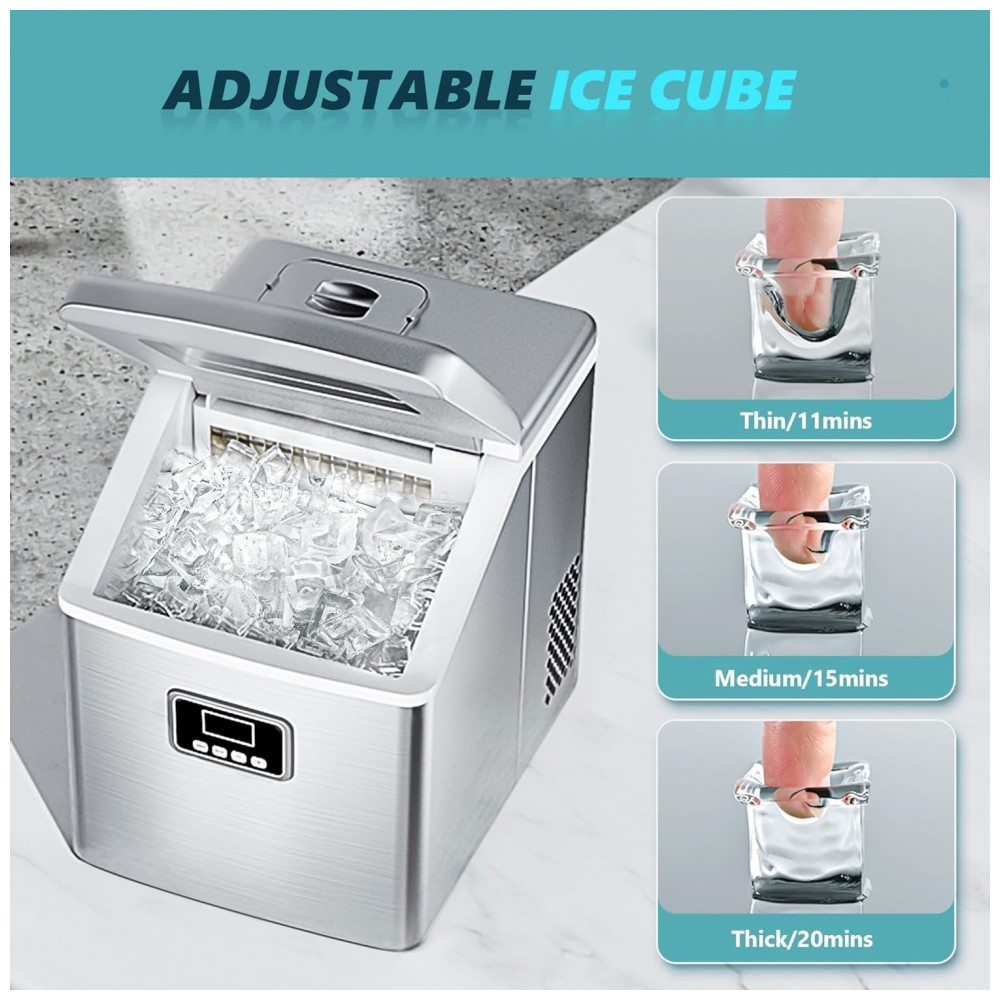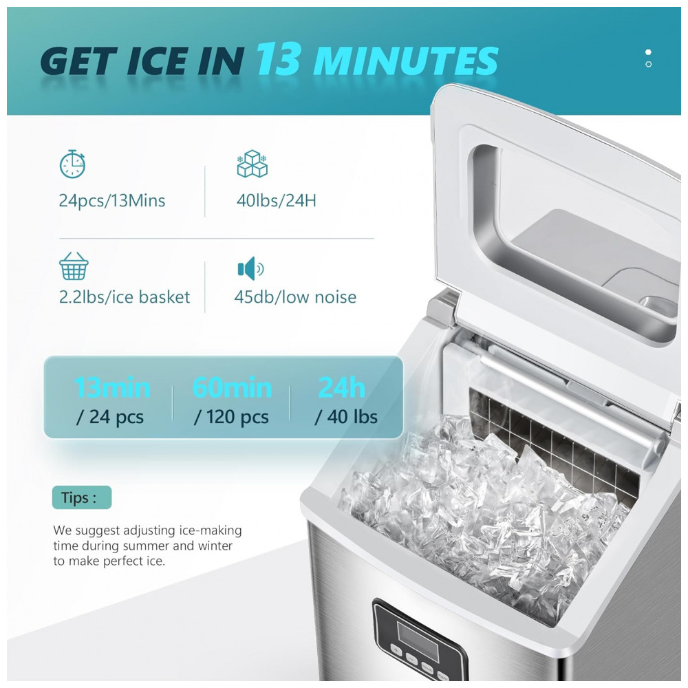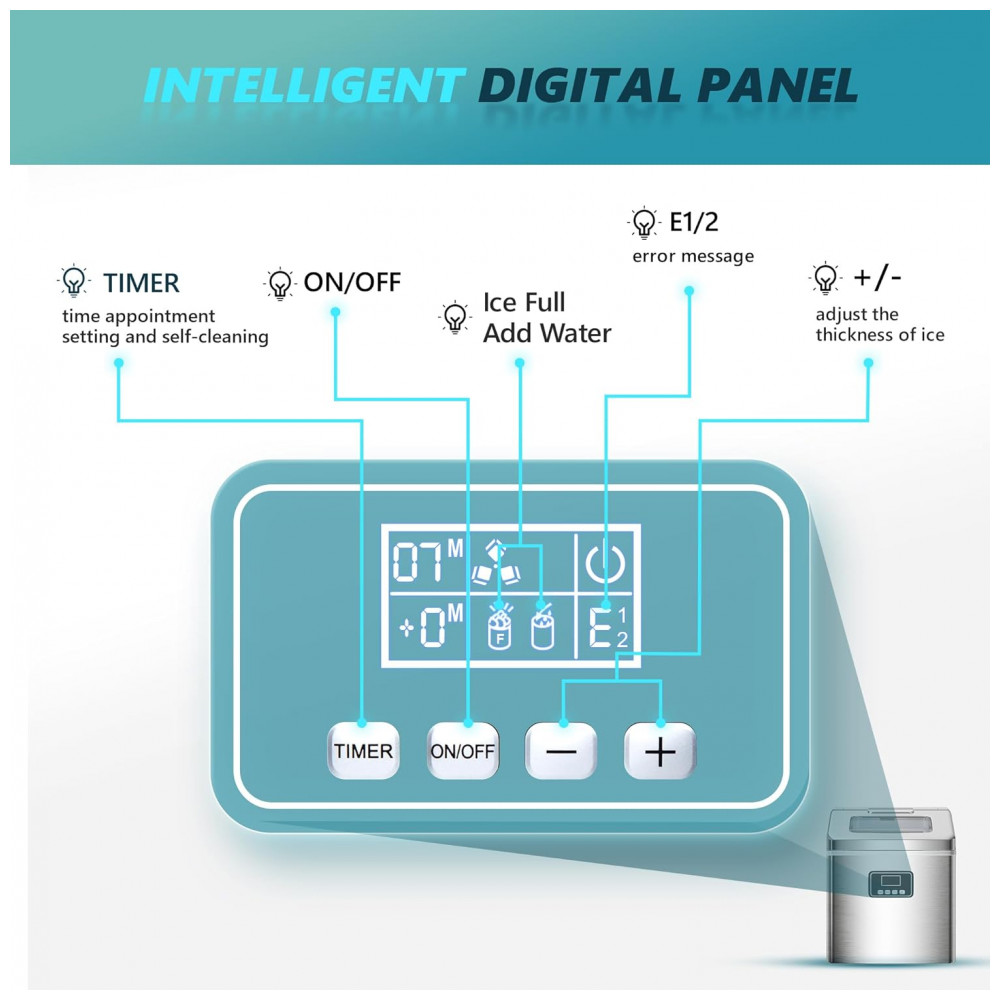 MANUTENÇÃO FÁCIL E FÁCIL DE USAR O design independente de aço inoxidável oferece um posicionamento flexível. Uma cesta de gelo removível de 1 kg e uma colher simplificam a recuperação do gelo. Limpe, use e transporte facilmente esta máquina de fazer gelo. Pressione o botão TIMER por 5 segundos para ativar a função de limpeza automática. Mantenha o fabricante de gelo de mesa na posição vertical por 24 horas antes do primeiro uso para obter os melhores resultados. Ideal para casa, escritório, cozinha, bar ou cafeteria.