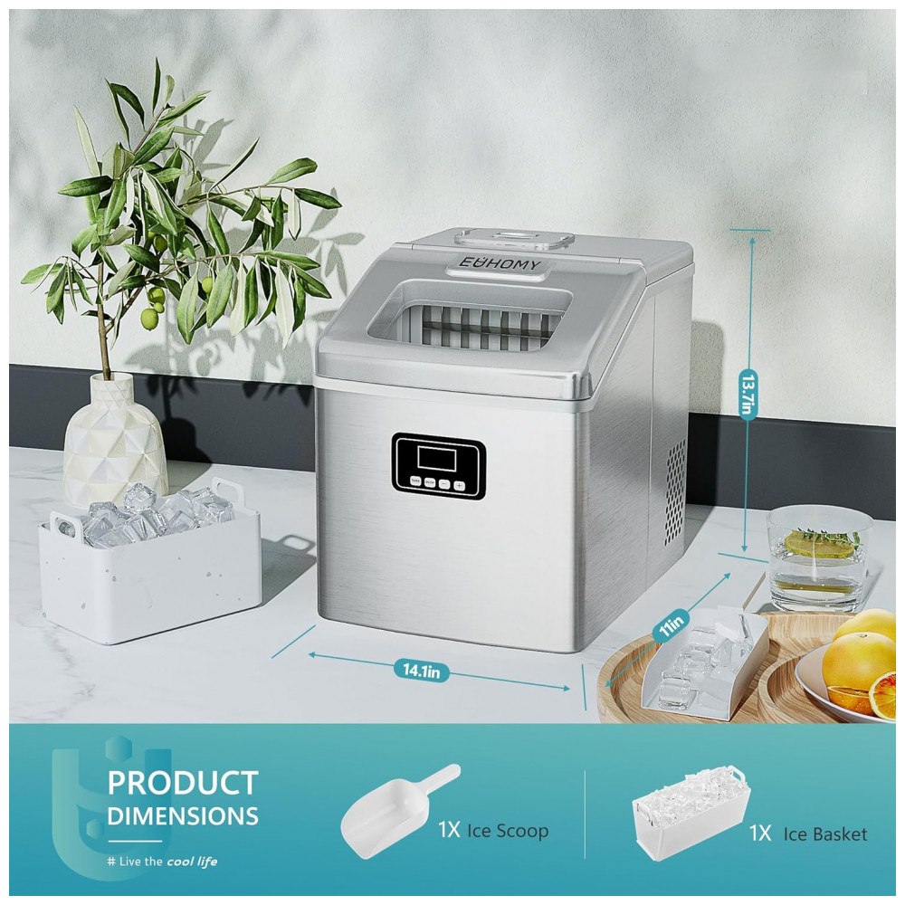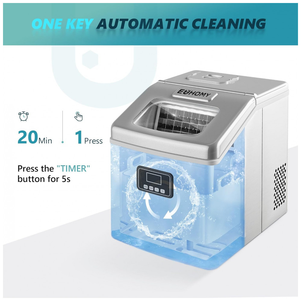 Máquina de Gelo até 18 kg em 24H Portátil com Autolimpeza Automática Colher e Cesta de Gelo 110V EUHOMY Prata