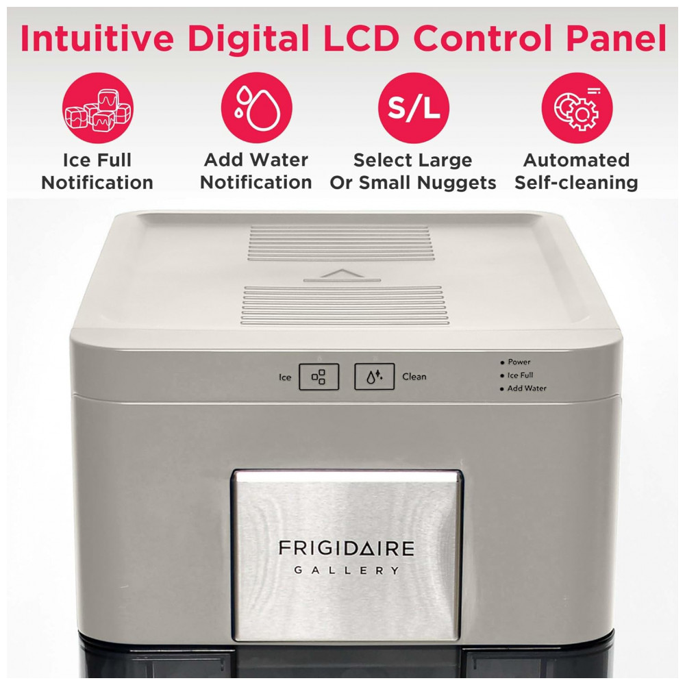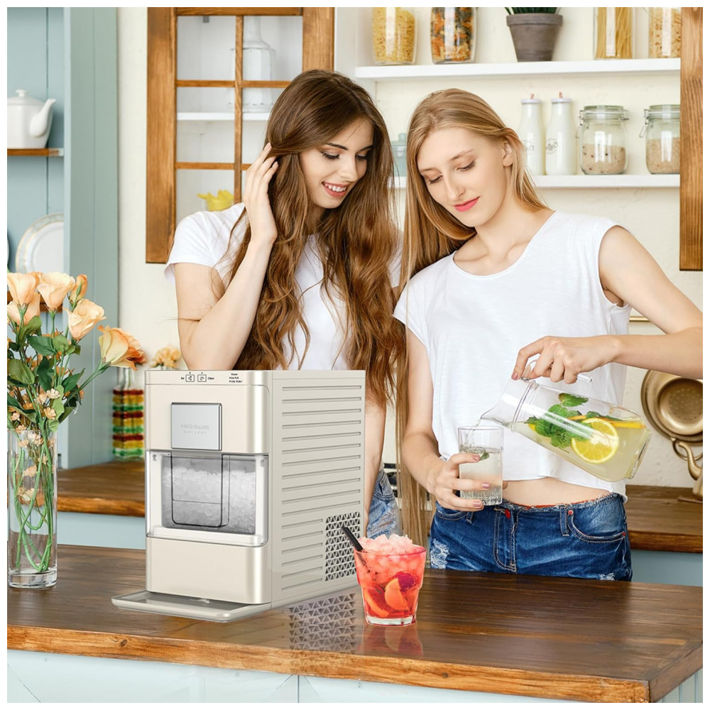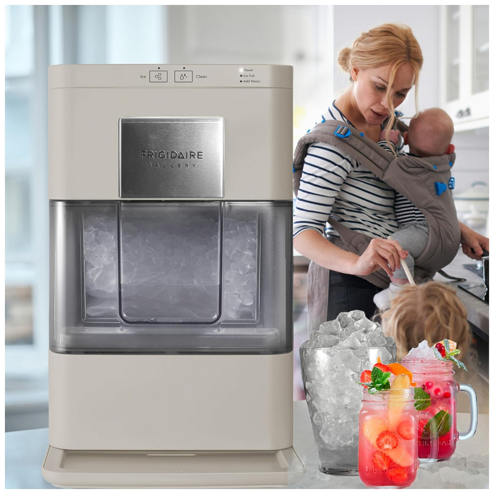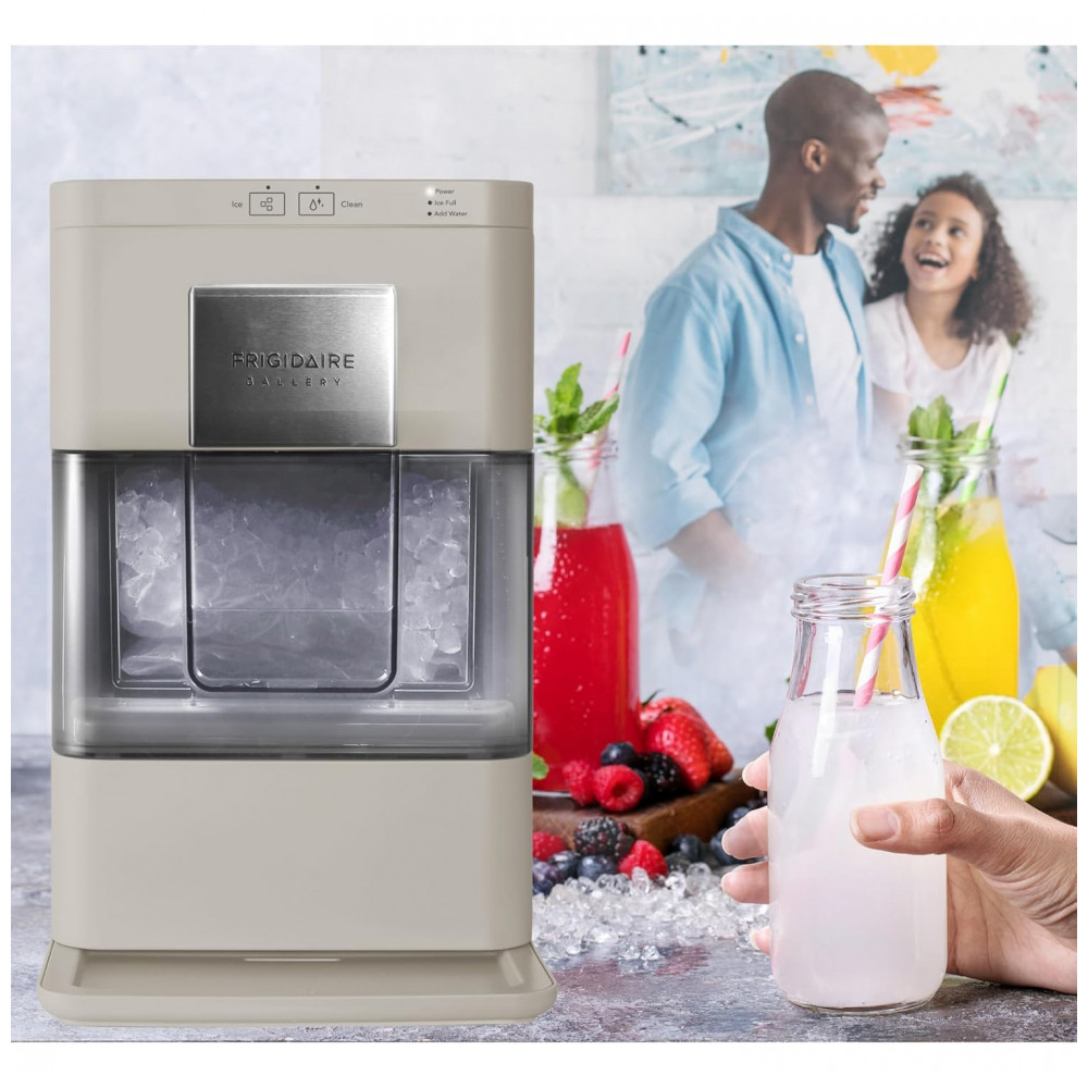 NUGGETS MASTIGÁVEIS E CROCANTES O fabricante de gelo para pepitas da Frigidaire Gallery permite que você desfrute de gelo com textura de pepita mastigável em comparação com cubos de gelo resistentes padrão. Desfrute de pepitas de gelo mastigáveis com qualidade de restaurante em sua própria casa. Nuggets macios e crocantes exclusivos que flutuam em sua bebida favorita.