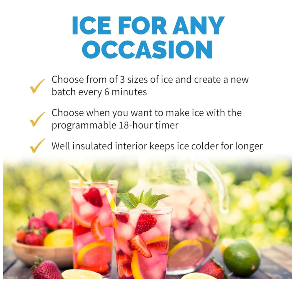 NUNCA FIQUE SEM GELO NOVAMENTE Esta máquina de gelo de bancada se encaixa perfeitamente no balcão da cozinha e produz 22 kg de gelo por dia para mantê lo abastecido para todas as suas necessidades de entretenimento. Isso é quase o mesmo que comprar cinco sacos de 4,5 kg de gelo comprado em uma loja em um único dia.