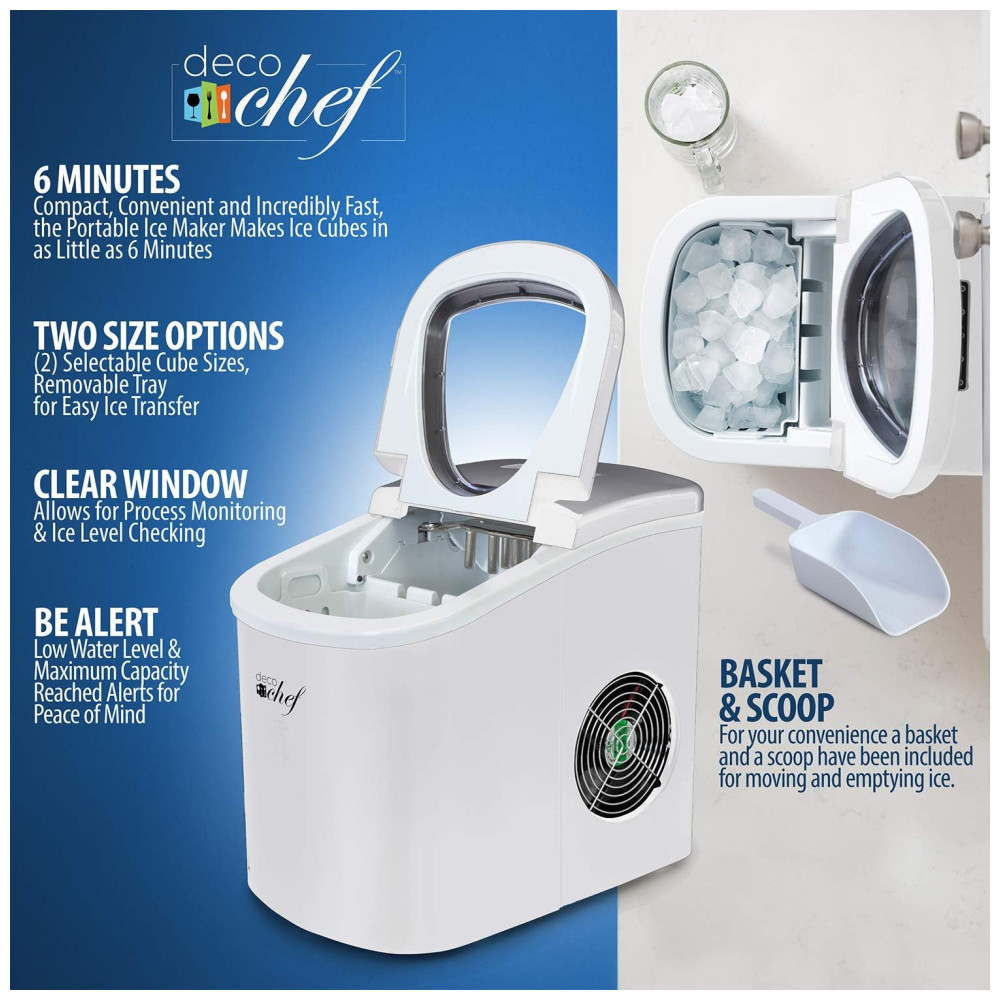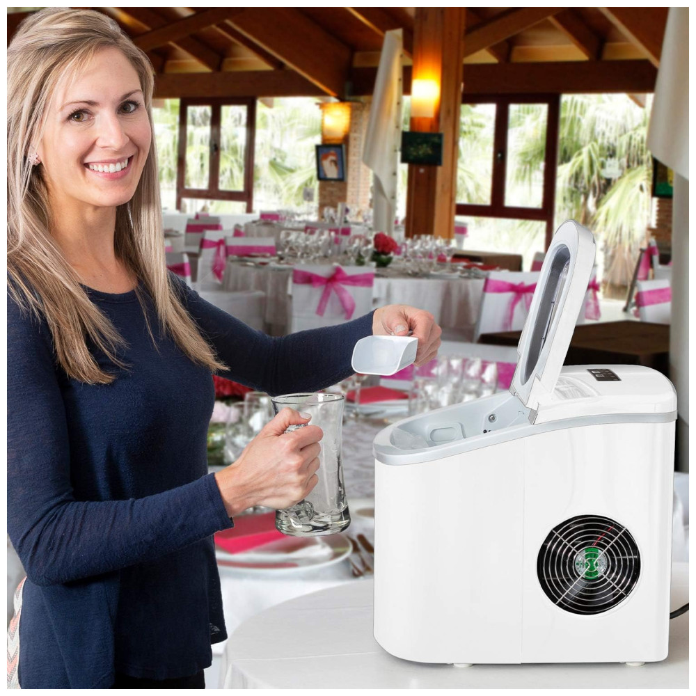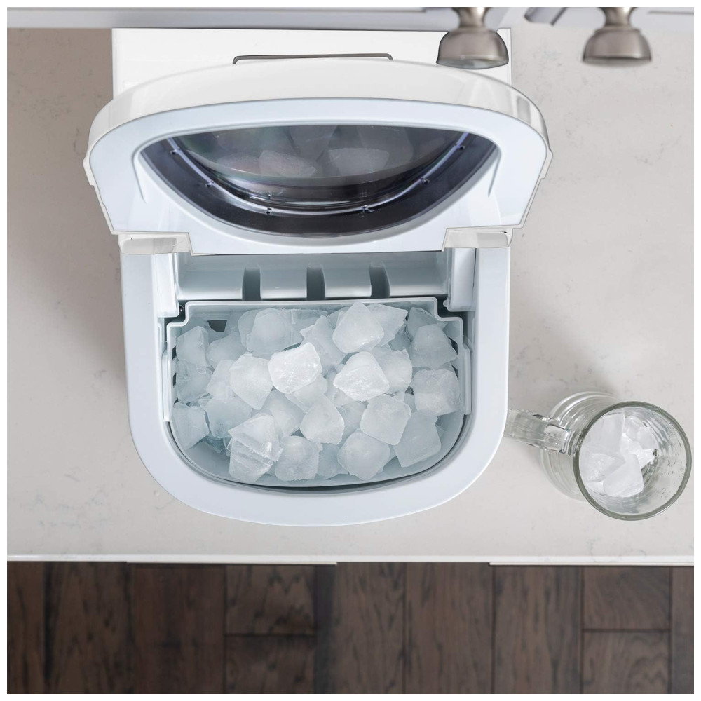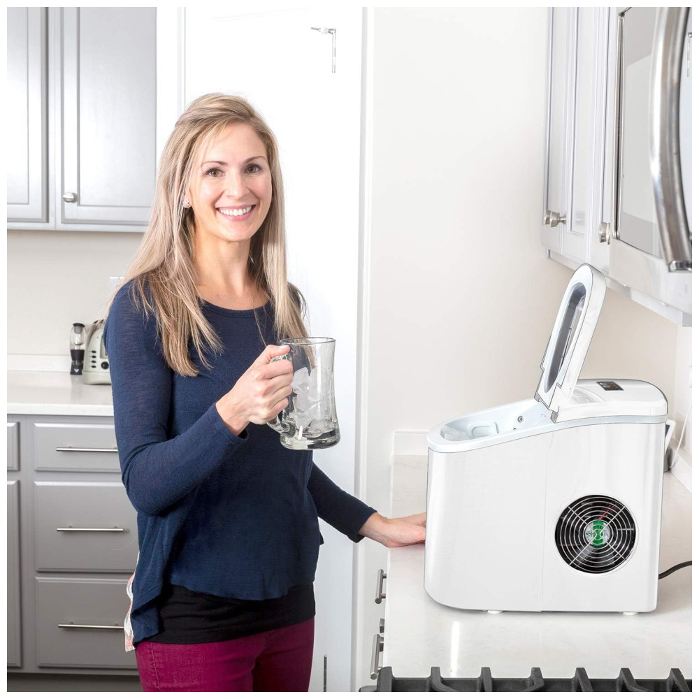 Esta máquina de fazer gelo atraente mais do que atenderá às suas necessidades de fabricação de gelo sem a necessidade de instalação. Perfeito para o seu RV, barco ou cozinha pequena, esta máquina de fazer gelo é compacta e portátil, funciona em qualquer lugar onde haja uma tomada disponível