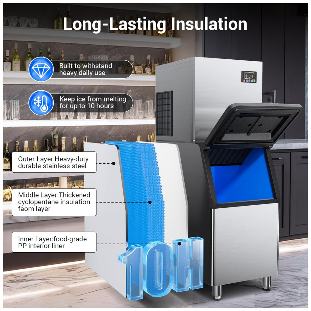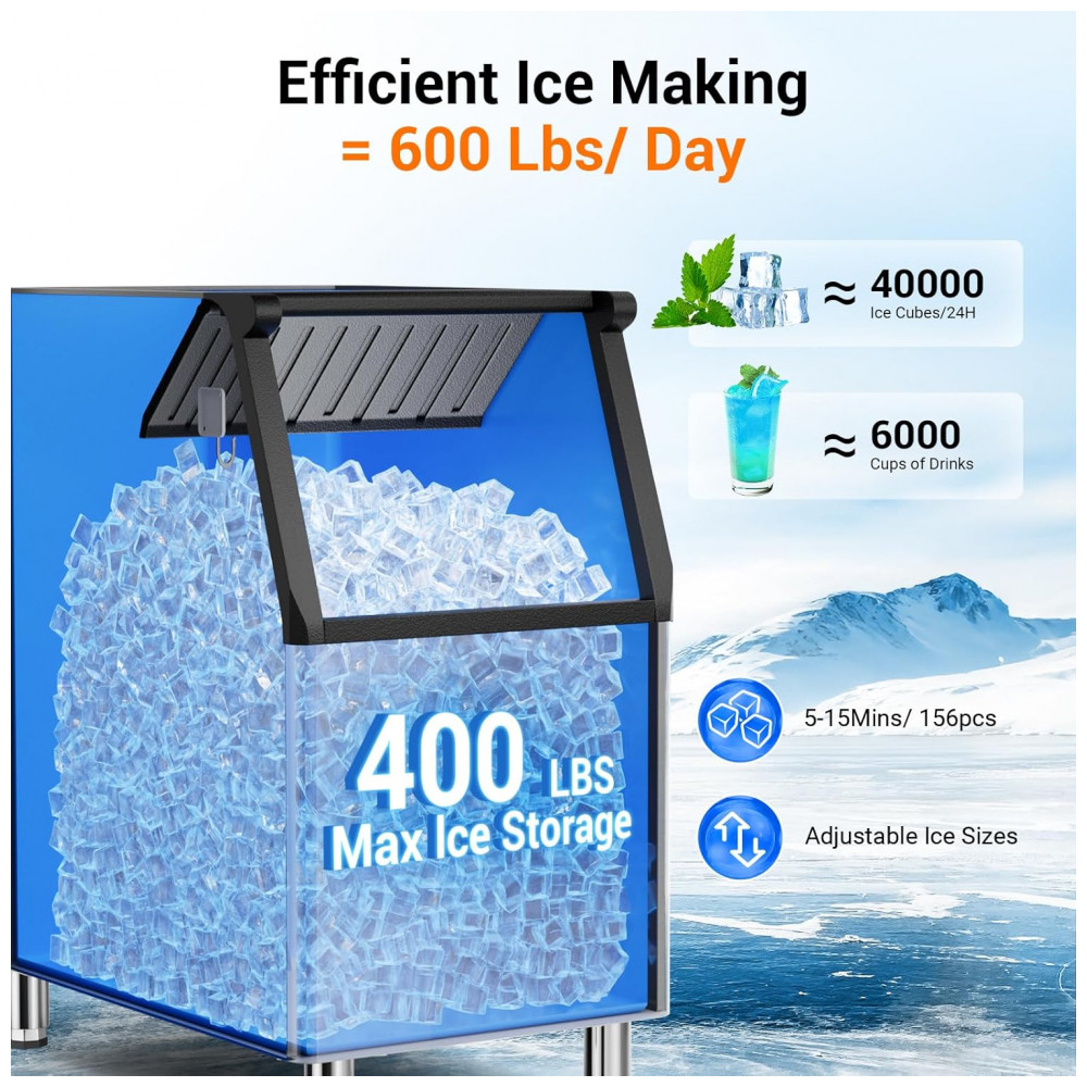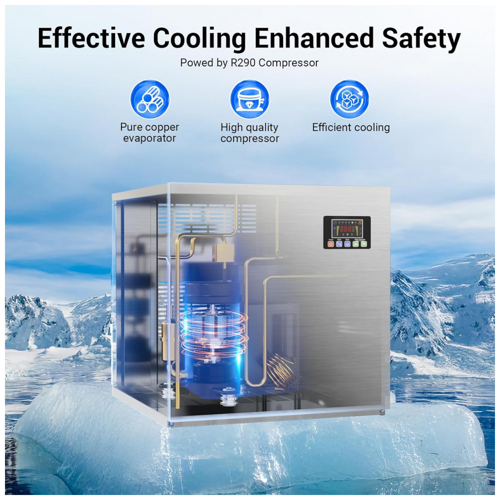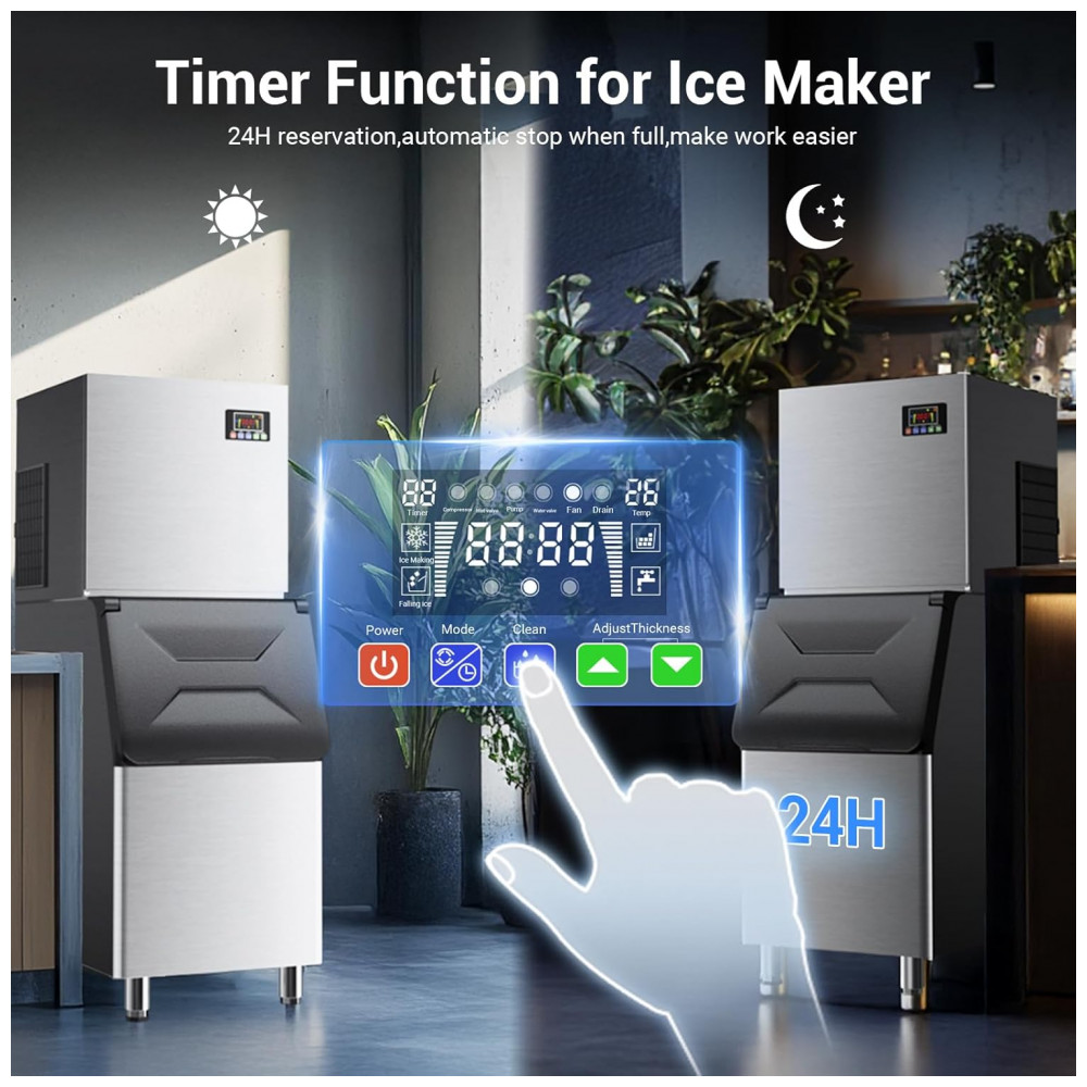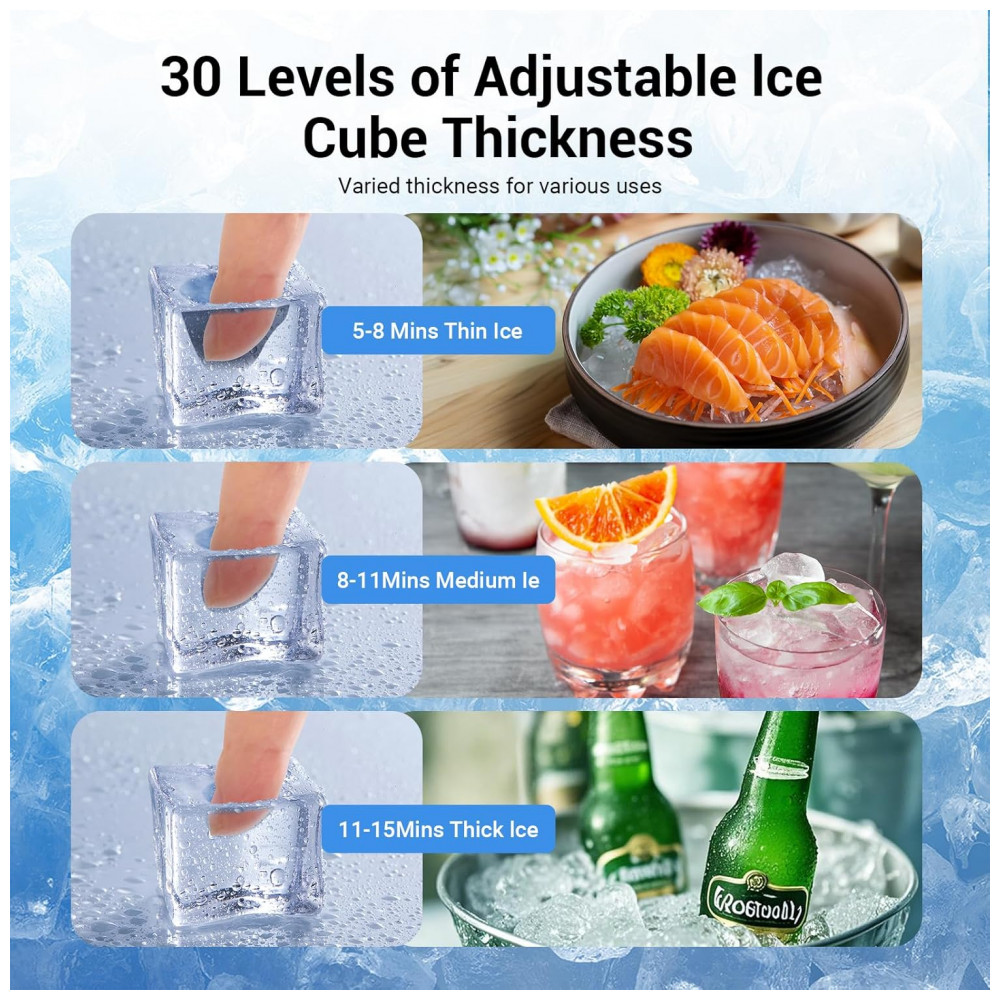 A Máquina de Gelo Comercial QAUSOU produz até 272 kg de cubos de gelo por dia com compressor de cobre puro e sistema de recirculação avançado, gerando 156 cubos em 5-15 minutos. Conta com 30 ajustes de espessura de gelo para configuração precisa em operações de bares, restaurantes ou eventos de alta demanda.