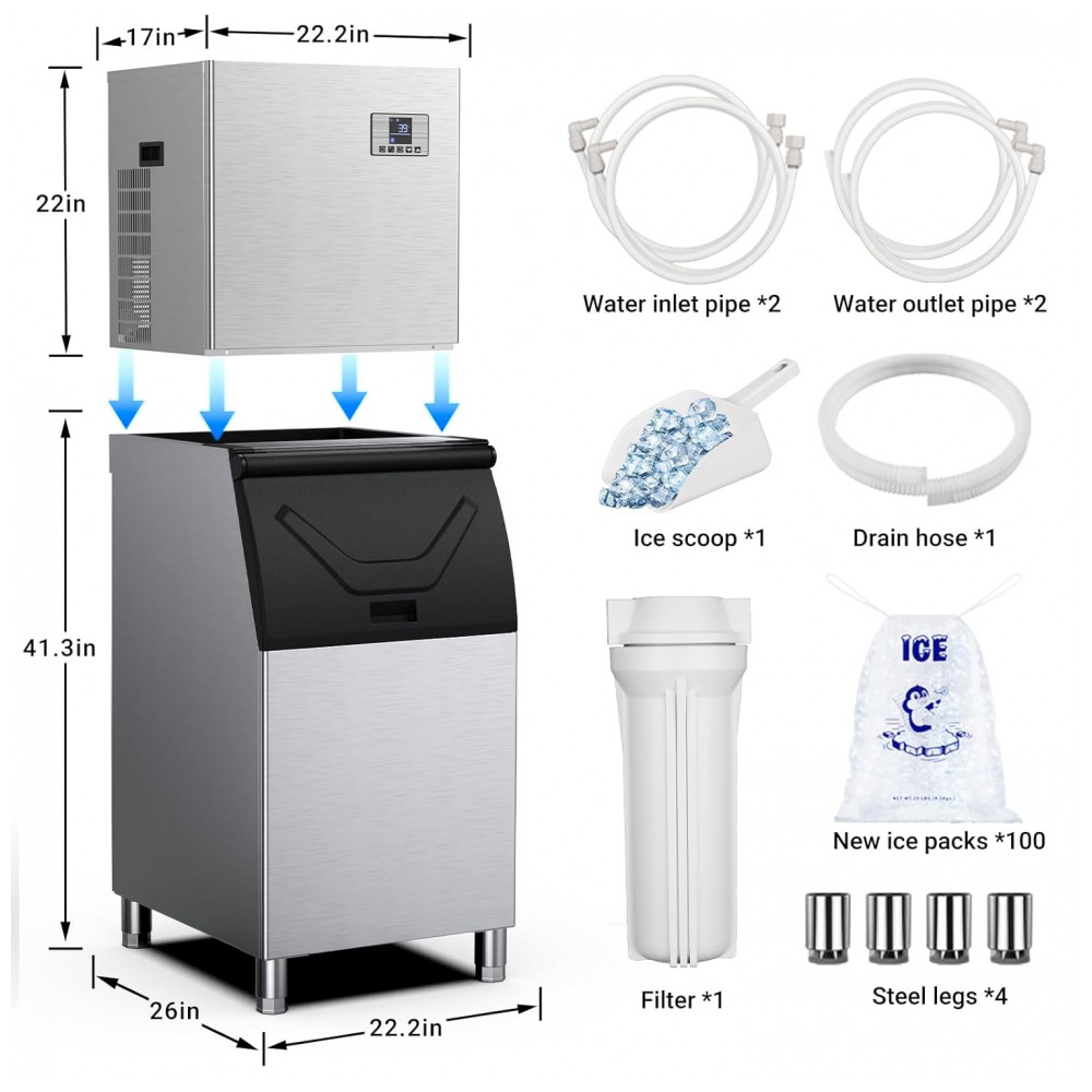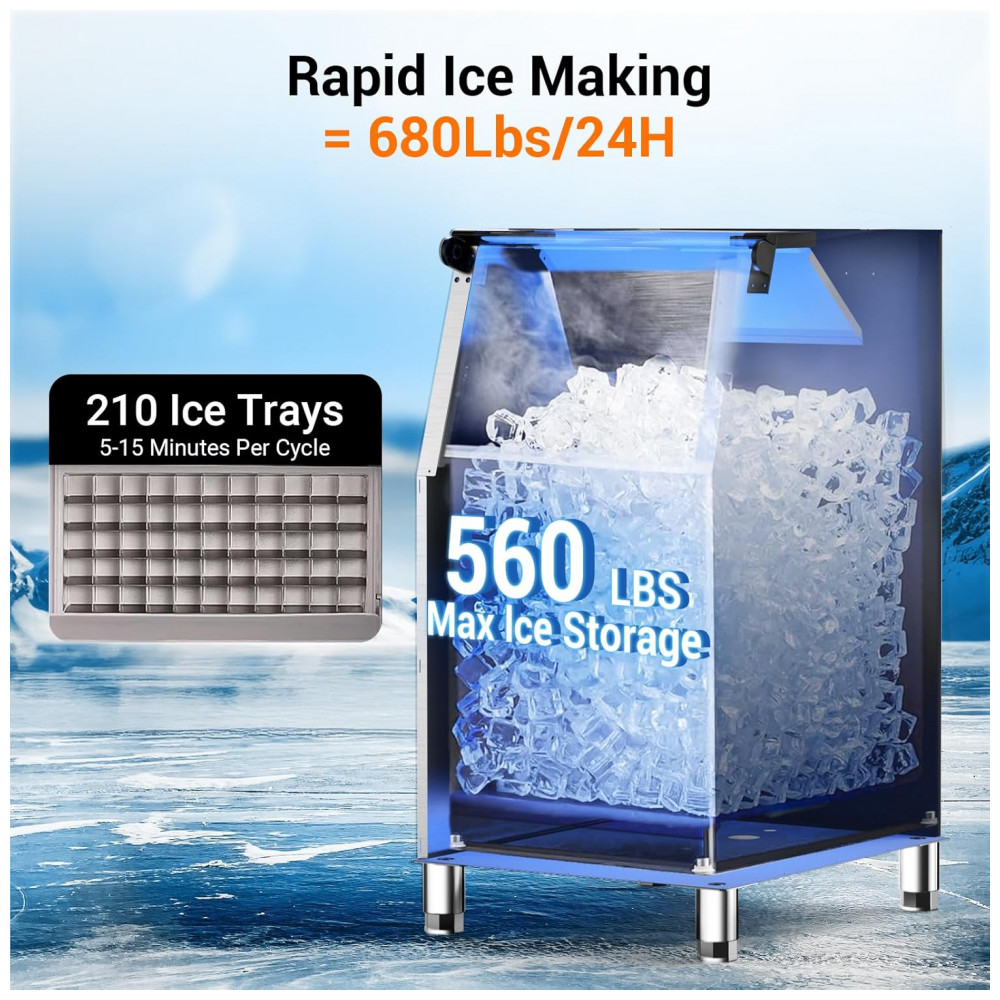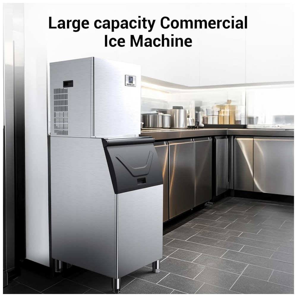 Máquina de Gelo Comercial QAUSOU Aço Inox 308 kg/dia Bin 254 kg Autolimpeza Temporizador IM-NS451B 110V