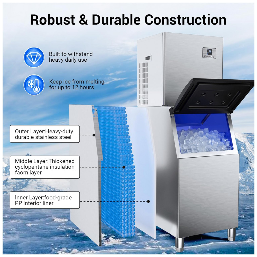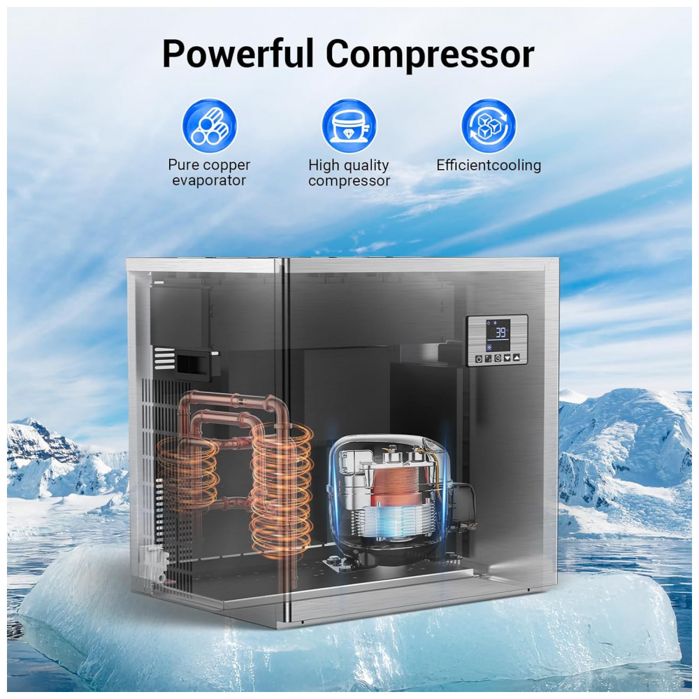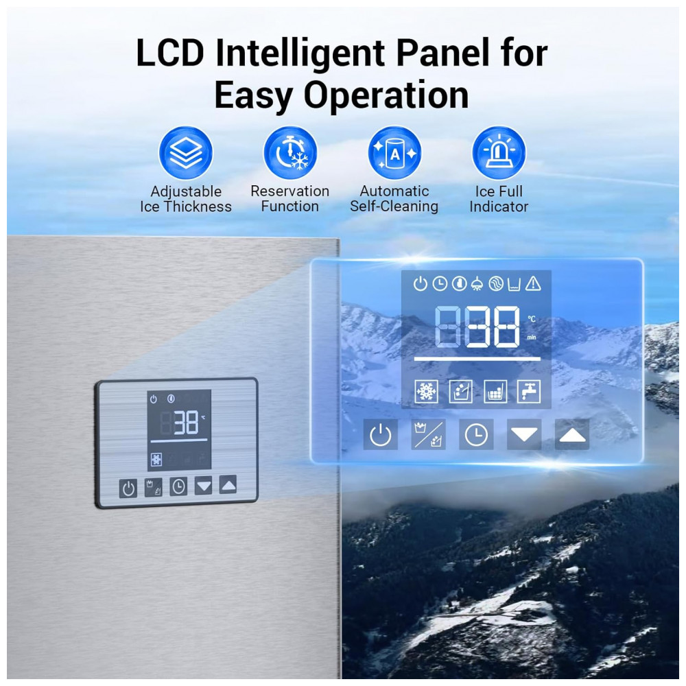A Máquina de Gelo Comercial QAUSOU produz até 308 kg de cubos de gelo por dia com compressor de cobre puro de alta eficiência e sistema de recirculação avançado, gerando 210 cubos em 5-15 minutos. Oferece 12 ajustes de espessura de gelo para personalização técnica precisa em operações contínuas de bares, restaurantes ou eventos.