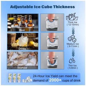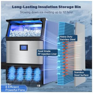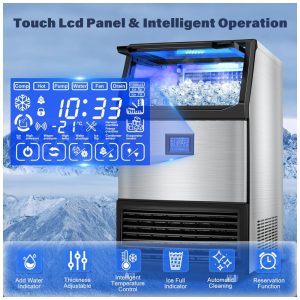 O painel LCD touch intuitivo permite ajuste preciso da espessura dos cubos, programação de temporizadores e ativação de autolimpeza em um toque. O sistema de filtragem de água integrado purifica a água da torneira, produzindo cubos transparentes e sem impurezas. A estrutura em aço inoxidável com revestimento interno em PP grau alimentício assegura durabilidade e higiene, enquanto a espessa camada de isolamento de espuma minimiza o derretimento do gelo armazenado.