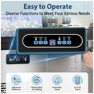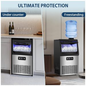 Máquina de gelo comercial de instalação sob bancada ou freestanding, construída em aço inoxidável, projetada para produção contínua de cubos de gelo em ambientes residenciais e comerciais. Equipada com compressor de 235W de alta eficiência, produz 36 cubos sólidos e transparentes em ciclos de aproximadamente 9 a 15 minutos, com capacidade de produção de até 45 kg de gelo em 24 horas. O reservatório integrado comporta cerca de 9 kg de gelo armazenado, garantindo disponibilidade contínua para uso intensivo.