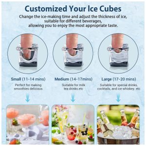 Inclui função de autolimpeza, que realiza ciclos automáticos de enxágue interno, e função de descongelamento, aumentando a vida útil do sistema de refrigeração. O resfriamento é feito por ar, utilizando refrigerante ecológico R290a, o que aumenta a eficiência energética e permite operação com menor consumo elétrico e baixo nível de ruído. O gabinete compacto possui dimensões aproximadas de 33,5 cm (profundidade) x 34,3 cm (largura) x 67 cm (altura), facilitando a integração sob bancadas, sobre balcões ou como unidade independente. Acompanha pá para gelo, filtro de água, mangueira de alimentação de água e mangueira de drenagem para escoamento contínuo.