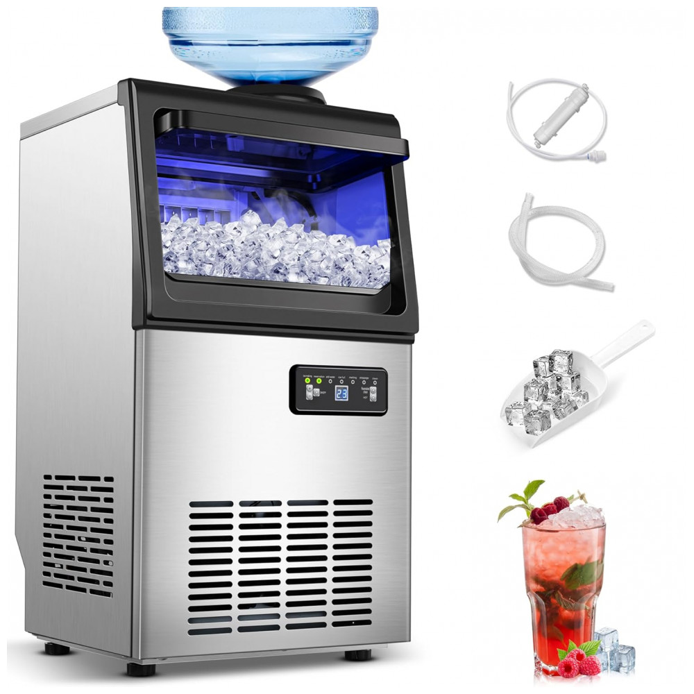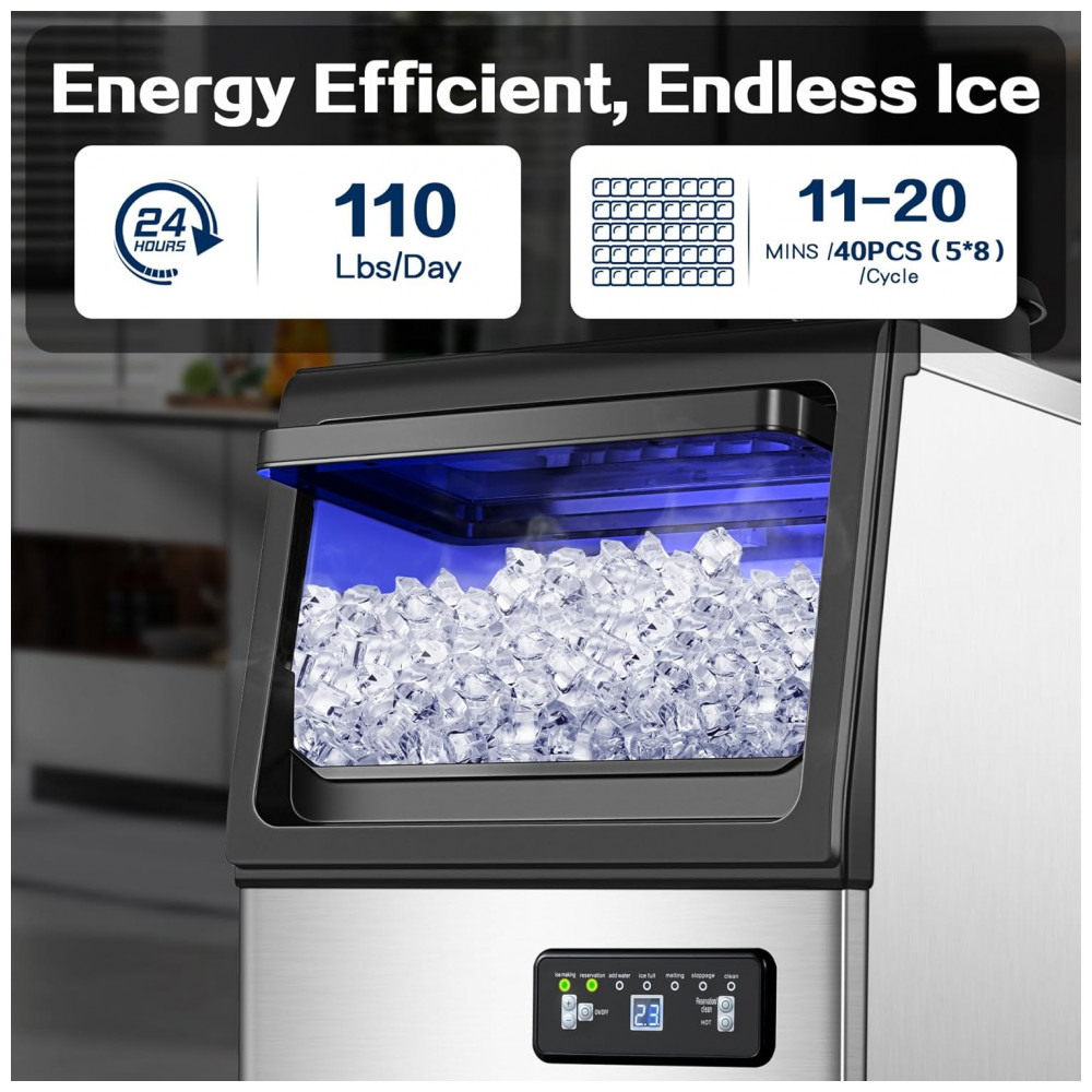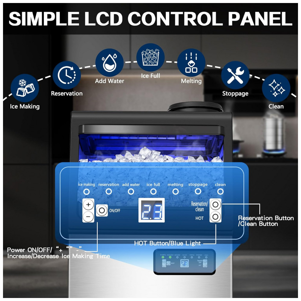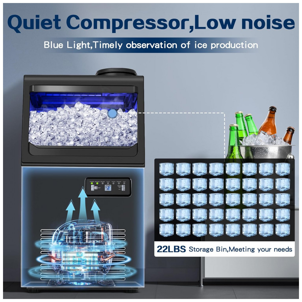 A Máquina de Gelo Comercial Zomagas SKF-ATS40FT produz até 110 libras (50 kg) de gelo por dia, com ciclos de 40 cubos, graças ao compressor eficiente e potente. Equipada com reservatório de armazenamento de 22 libras (10 kg), é ideal para uso em bares, restaurantes, hotéis e cafeterias. Oferece opções duplas de entrada de água, compatíveis com água filtrada da torneira ou garrafas, gerando cubos de gelo cristalinos em cada ciclo.