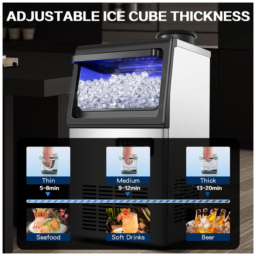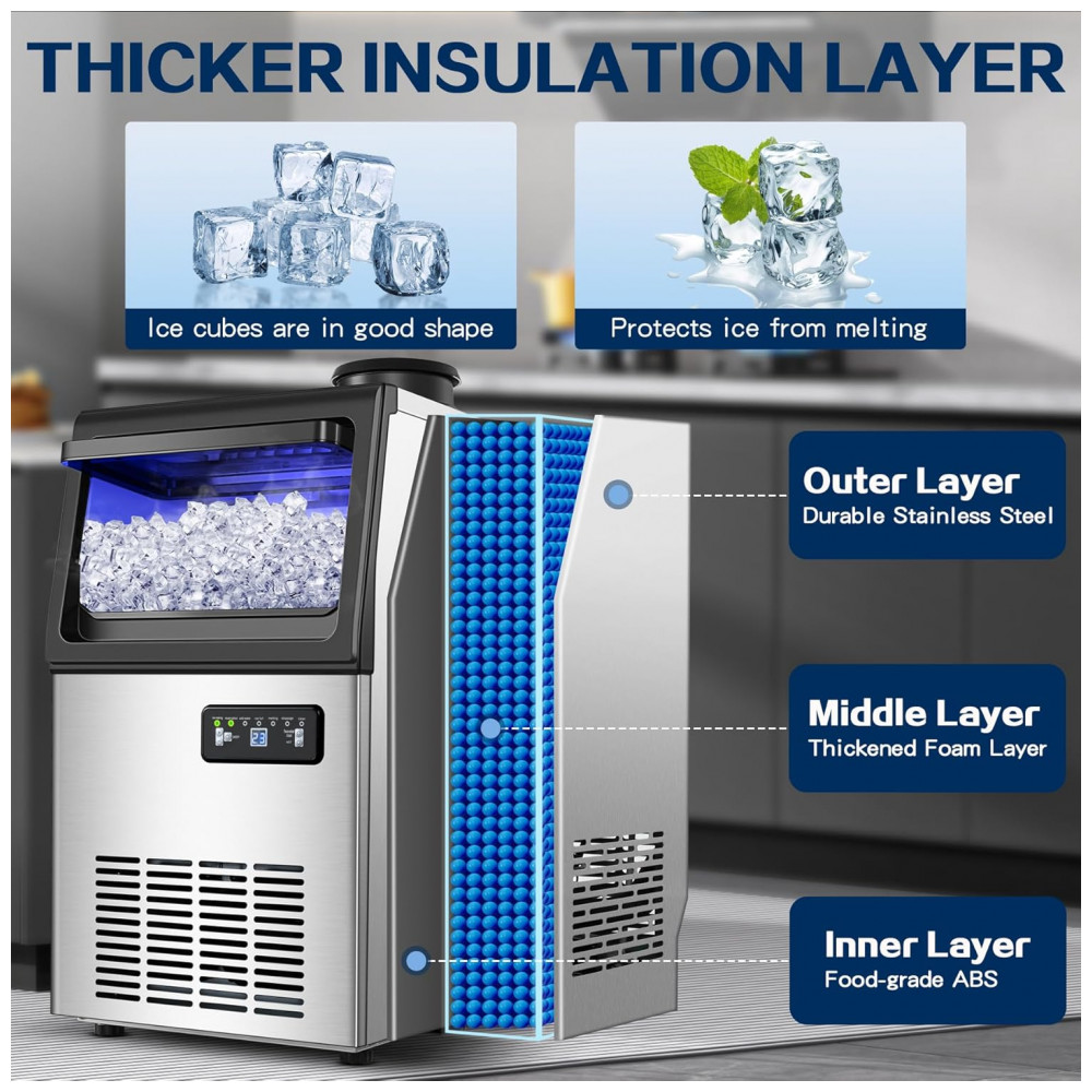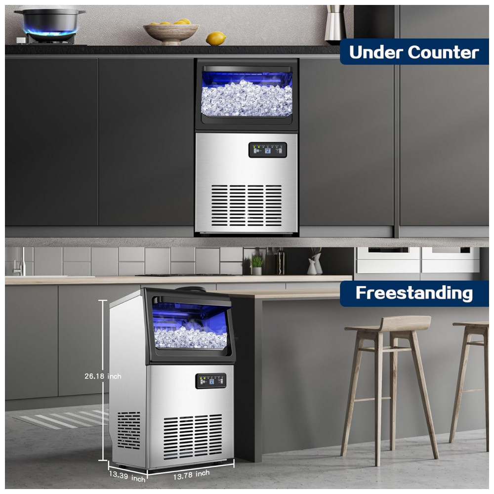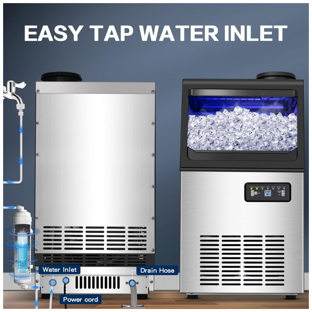 Otimizada para desempenho técnico, utiliza refrigerante R290a e inclui mangueira de entrada de água. A voltagem original de 110V suporta instalação flexível como unidade sob bancada ou independente, atendendo demandas de produção de gelo em escala comercial com eficiência energética e baixa emissão sonora.
