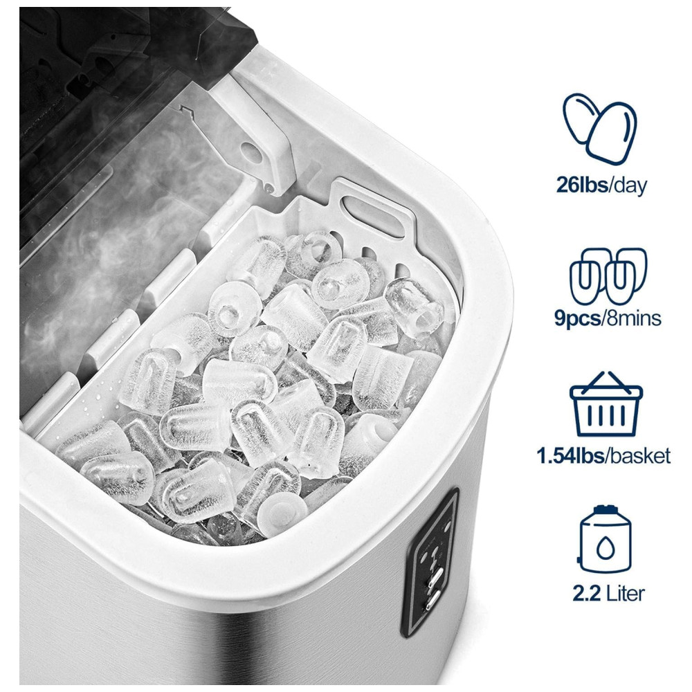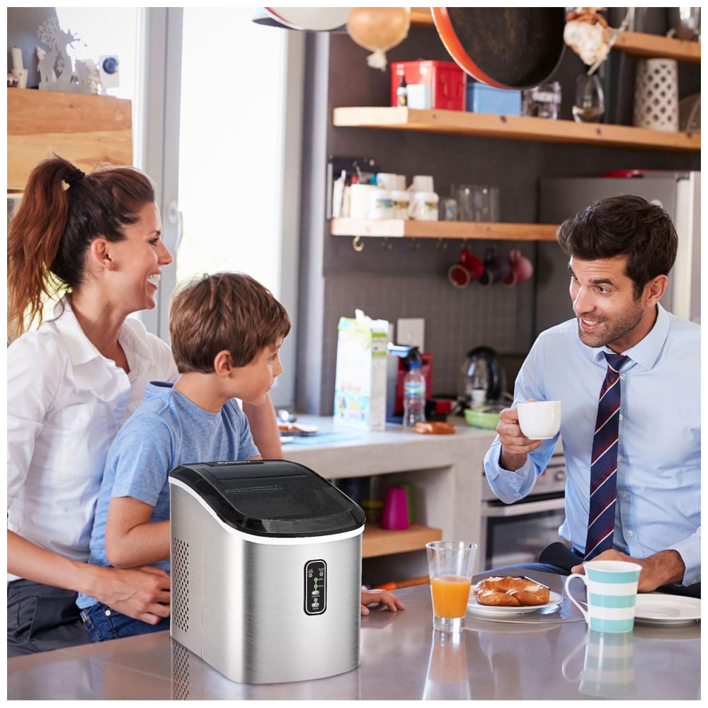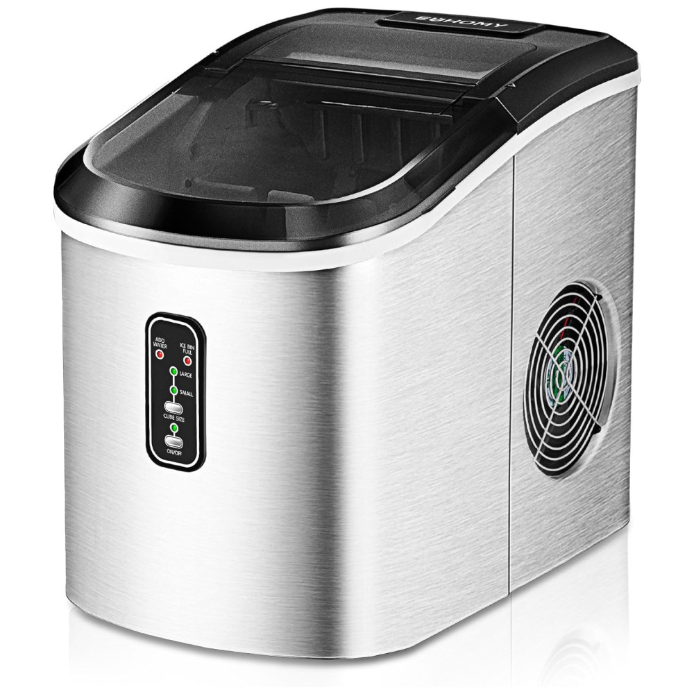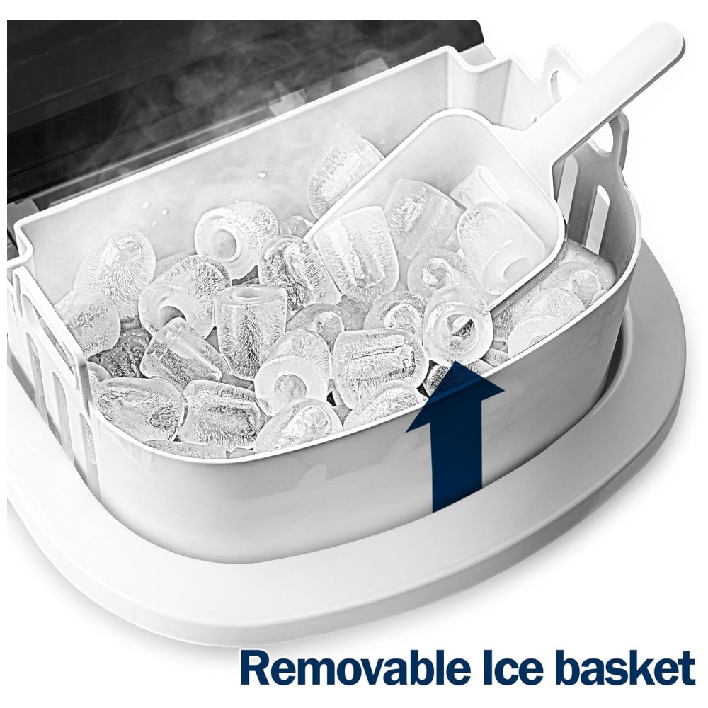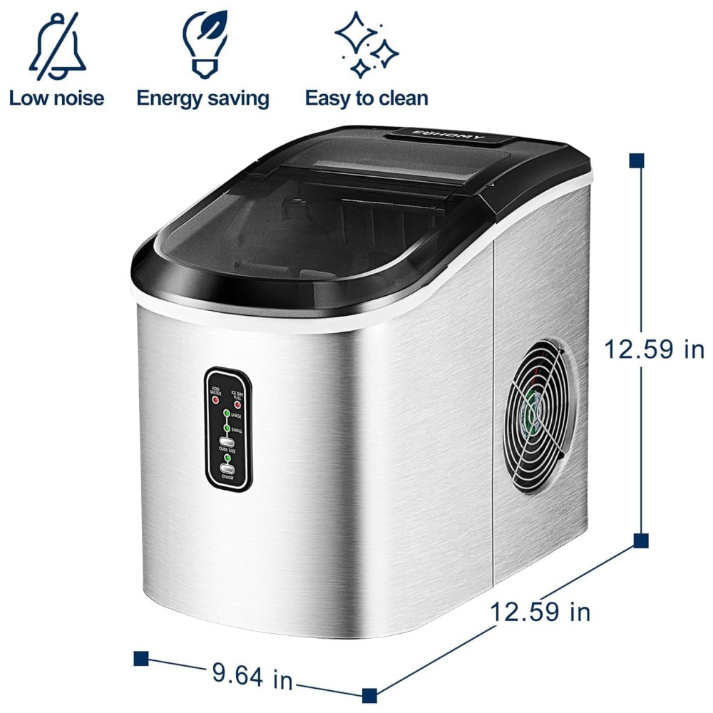 Cubos de gelo em forma de bala A bancada da máquina de fazer gelo da Euhomy pode produzir cubos de gelo mastigáveis e deliciosos em forma de bala. A cada dia, a máquina de fazer cubos de gelo pode gerar cerca de 12kg de gelo e levar uma média de 8 minutos para cada ciclo de fabricação de gelo. Euhomy A máquina de fazer gelo portátil com melhor classificação tem dois tamanhos de cubos de gelo selecionáveis, é perfeita para refrigerar bebidas ou alimentos. Painel de controle intuitivo Máquina de fazer gelo de bancada com painel de controle intuitivo. Os usuários podem ver através da janela transparente para monitoramento do processo e verificação do nível de gelo. O design moderno também usa um indicador luminoso que o informa para adicionar mais água quando o nível de água no reservatório estiver baixo. Ou quando o balde de gelo estiver cheio, você será alertado para remover todos os cubos de gelo para o próximo ciclo de fabricação de gelo. Sensor infravermelho e cesta de gelo removível A bancada da máquina de gelo Euhomy está equipada com a mais avançada tecnologia de sensor infravermelho. A máquina de gelo de bancada pode ajudá lo a fazer um ciclo automático de cubos de gelo deliciosos. A máquina de fazer gelo de mesa também inclui uma cesta de gelo removível e uma colher de gelo extra. Tudo para lhe proporcionar a melhor experiência de bebida possível. Eficiente em energia e silencioso A máquina de fazer gelo de bancada da Euhomy está equipada com a mais avançada tecnologia de refrigeração, incluindo um compressor silencioso que cuida da refrigeração para que você possa desfrutar de um lote de gelo sem suportar muito ruído. Simples de usar Em termos de facilidade de uso, o mini fabricante de gelo não requer nenhuma instalação permanente. Compacta, fácil de limpar, controlar e transportar, a máquina de fazer gelo pequena é uma máquina de fazer gelo doméstica atraente para trailers, bancadas de cozinha, quintais, barcos e muito mais. É melhor colocar a máquina de gelo de mesa na posição vertical por pelo menos 24 horas antes de usá la.