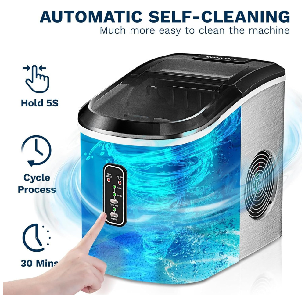 Tanque de água circulante A máquina de fazer gelo da Euhomy não só permite que você desfrute de cubos de gelo deliciosos e sem odores, mas também o ajudará a economizar água Nossa máquina de fazer gelo está equipada com um tanque de água de 2,2 litros que recicla a água do tanque, garantindo que nenhuma água seja desperdiçada