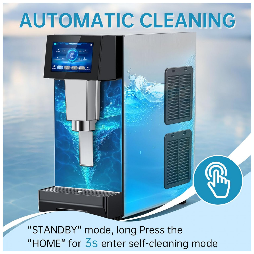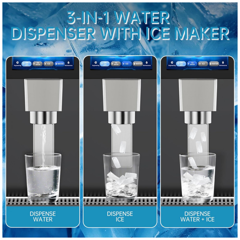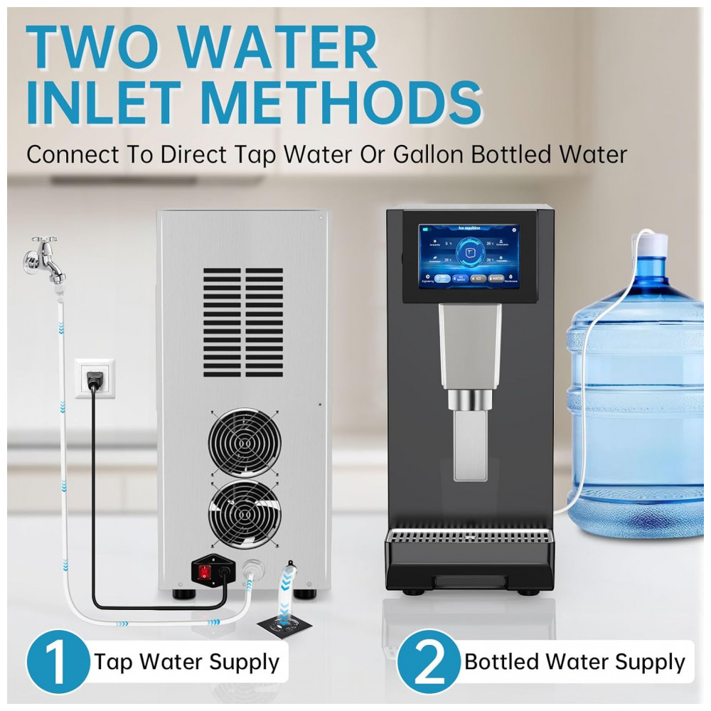 Recurso 3-em-1 com dispensador inteligente de gelo, água ou ambos, compatível com conexão direta à torneira ou garrafas via duas entradas de água. Inclui filtro de purificação para garantir gelo de alta qualidade, livre de impurezas, atendendo padrões de produção comercial.