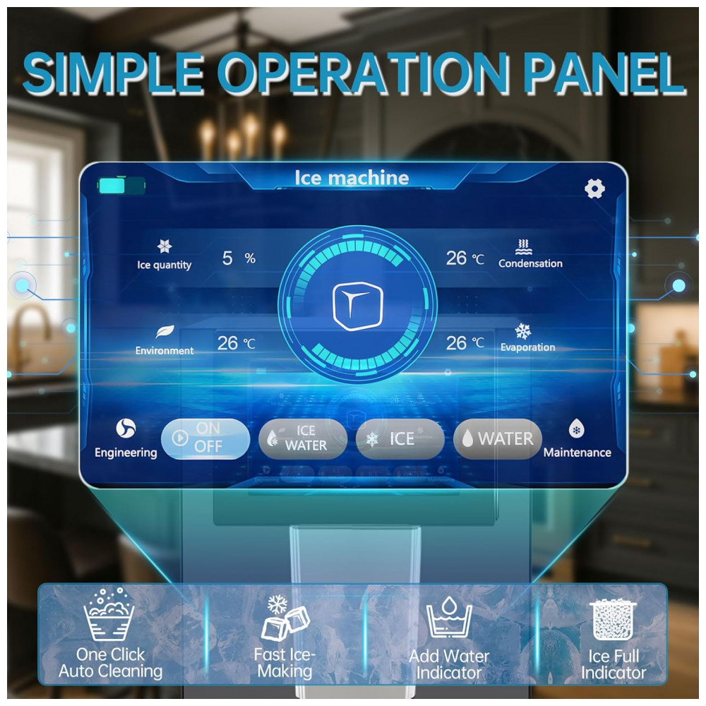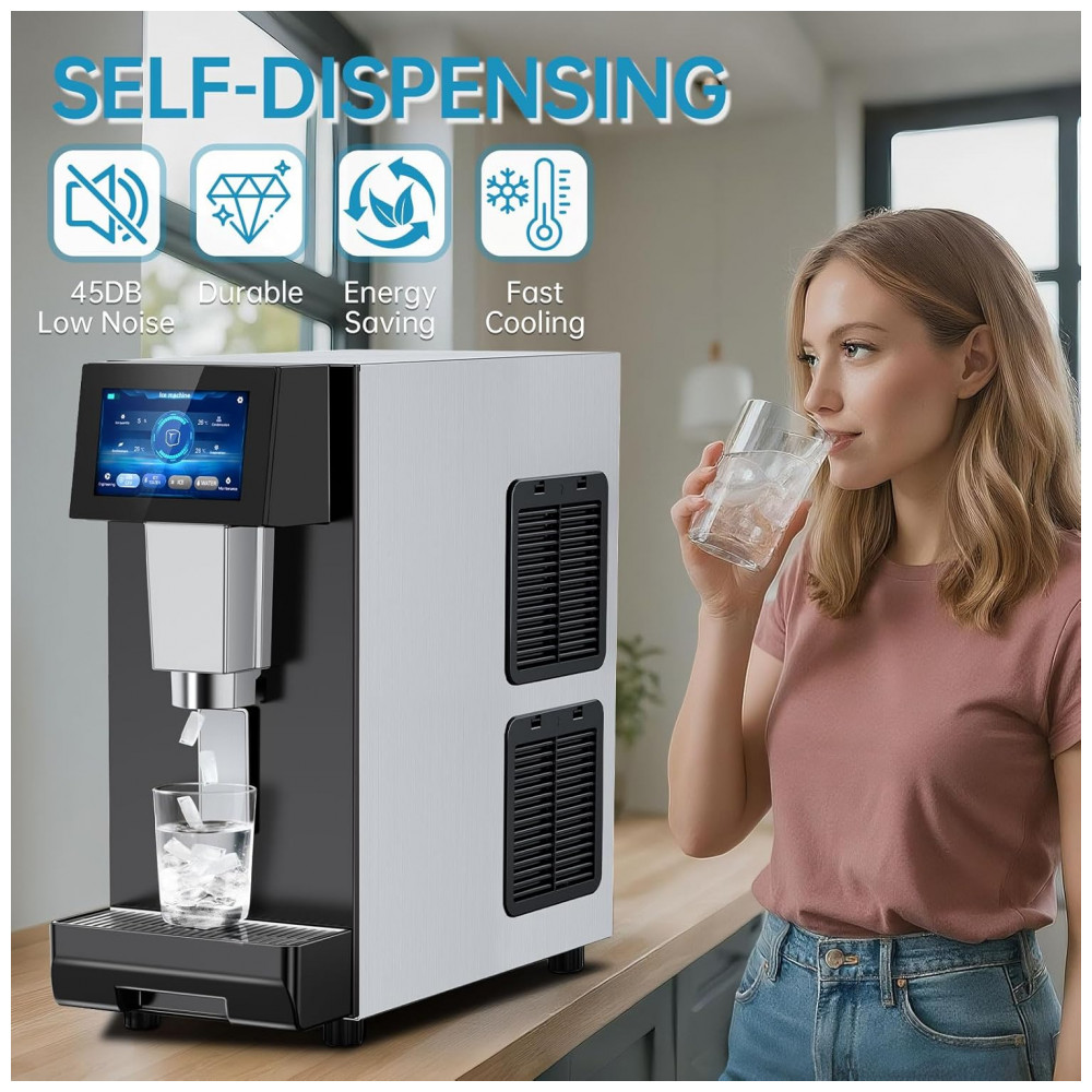 Compressor CFC-free de 350 W opera com eficiência energética 25% superior a modelos padrão, resfriando 30% mais rápido e em nível sonoro de apenas 45 dB, ideal para escritórios, bares e eventos. Painel LED intuitivo exibe indicadores de nível de água, gelo cheio e status operacional.