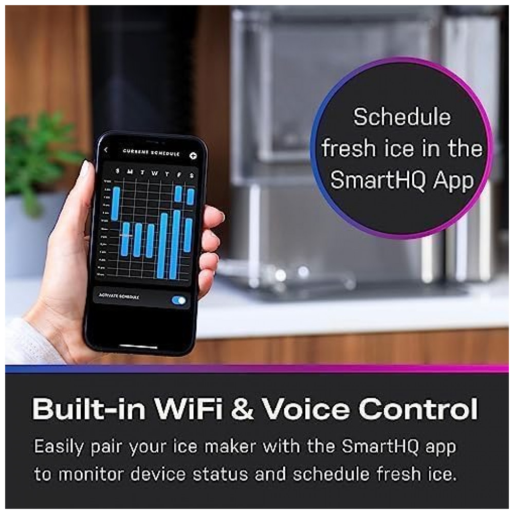 Controle inteligente via WiFi integra app SmartHQ para monitoramento de status, agendamento de produção e atualizações automáticas de software. Compatível com assistentes de voz Alexa e Google, oferece painel de controle para ajustes operacionais. Dimensões compactas de 44,5 cm de profundidade x 34 cm de largura x 42 cm de altura otimizam instalação em bancadas de cozinha ou bares.