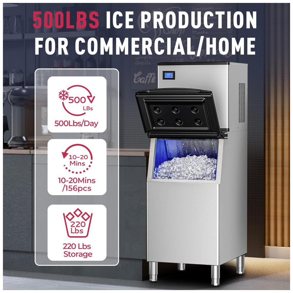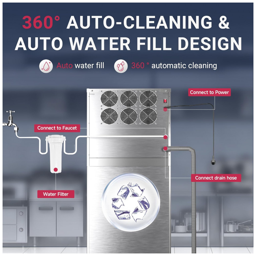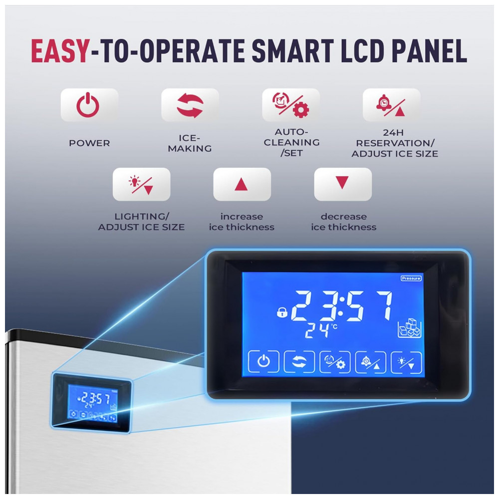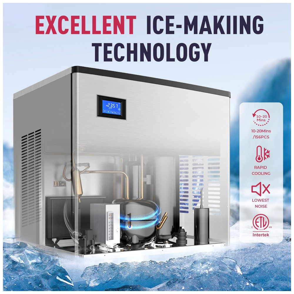 A Máquina de Gelo Industrial Icyglee é um equipamento comercial de alta capacidade, construído em aço inoxidável com compressor SECOP e certificação ETL, projetado para produção contínua de cubos cheios em restaurantes, bares, cafés e negócios. Produz até 227 kg de gelo por 24 horas, gerando 156 cubos por ciclo em 10-20 minutos, com bin de armazenamento de 113 kg para atender picos de demanda. O painel LCD intuitivo integra funções como reserva de 1-24 horas, alertas de gelo cheio e falta de água, contagem regressiva de produção, exibição de temperatura e limpeza automática, permitindo ajuste preciso do tamanho dos cubos via botões dedicados.