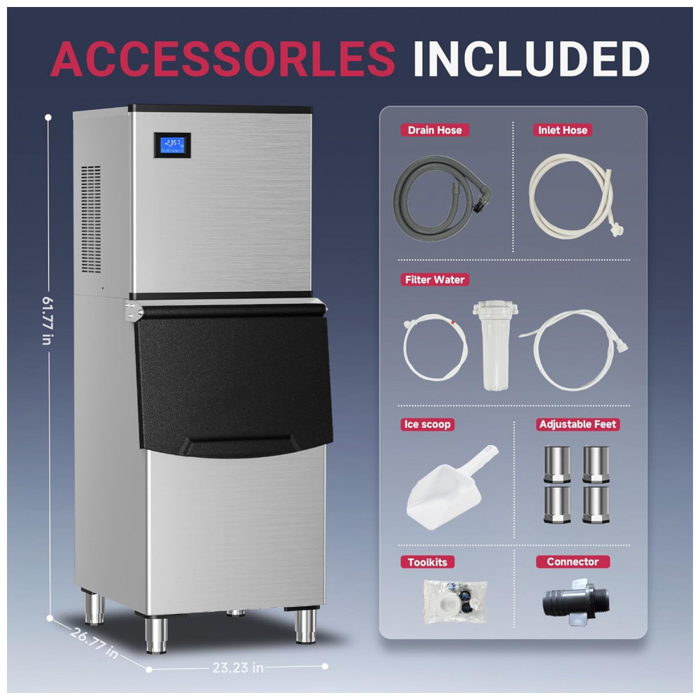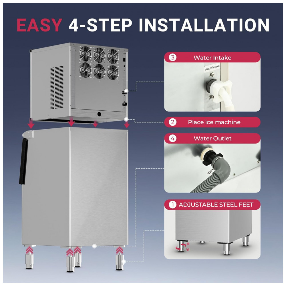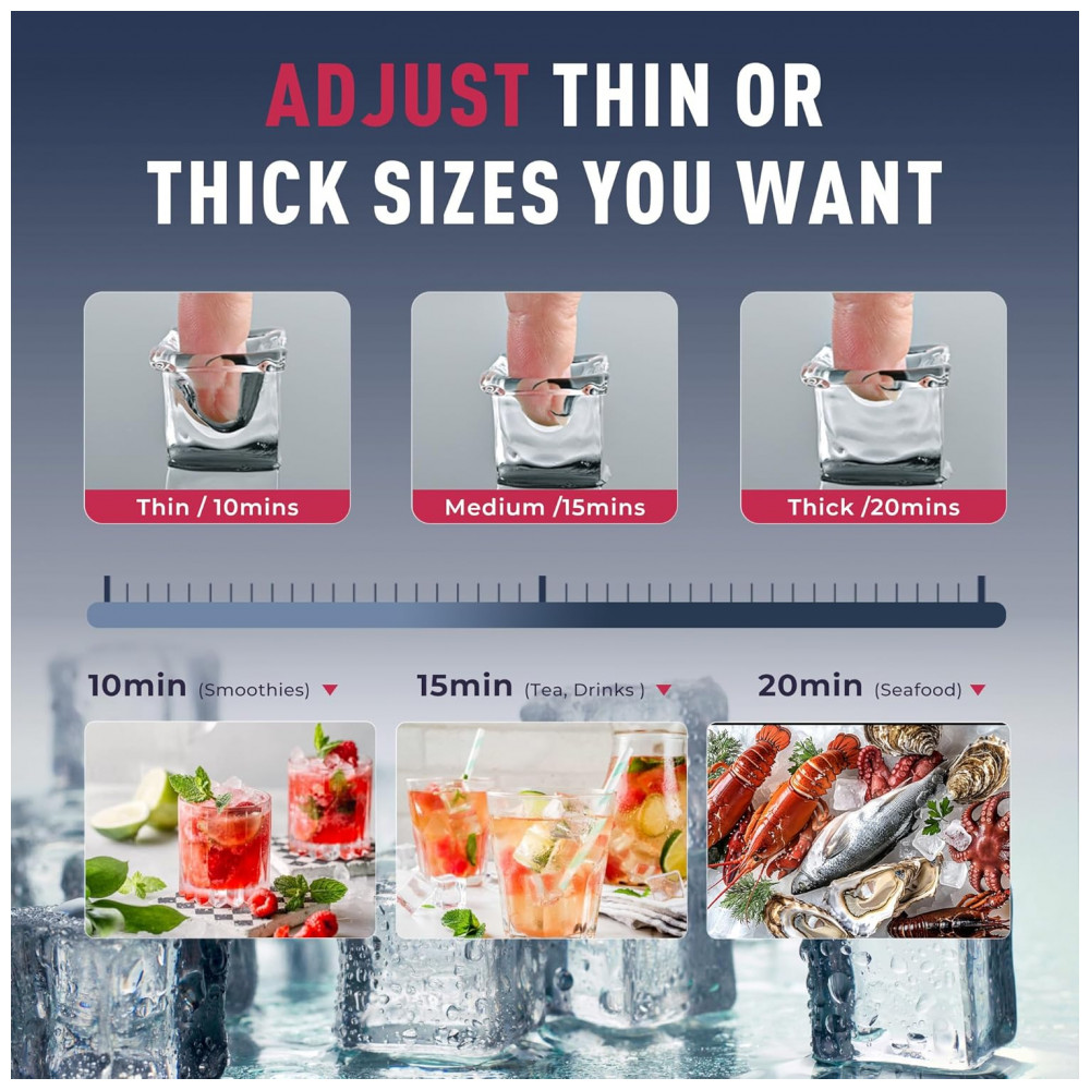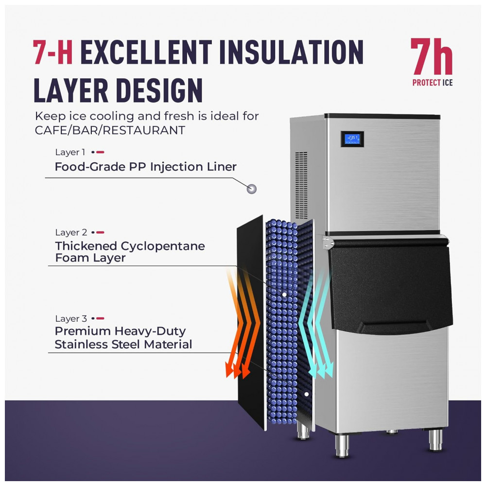 A Máquina de Gelo Industrial Icyglee é um equipamento comercial de alta capacidade, construído em aço inoxidável com compressor SECOP e certificação ETL, projetado para produção contínua de cubos cheios em restaurantes, bares, cafés e negócios. Produz até 227 kg de gelo por 24 horas, gerando 156 cubos por ciclo em 10-20 minutos, com bin de armazenamento de 113 kg para atender picos de demanda. O painel LCD intuitivo integra funções como reserva de 1-24 horas, alertas de gelo cheio e falta de água, contagem regressiva de produção, exibição de temperatura e limpeza automática, permitindo ajuste preciso do tamanho dos cubos via botões dedicados.