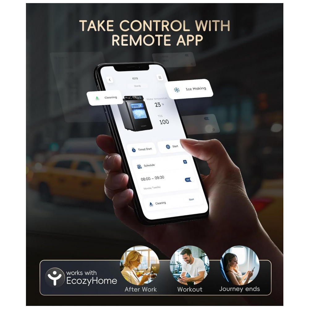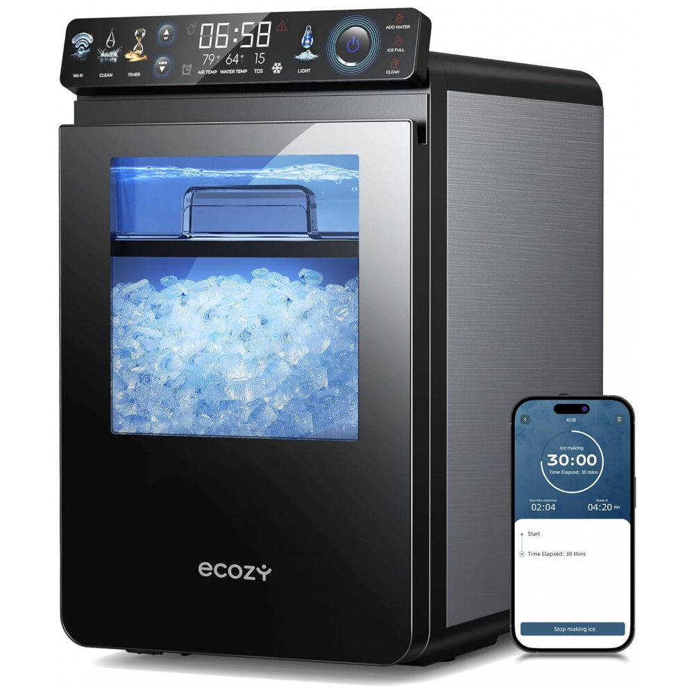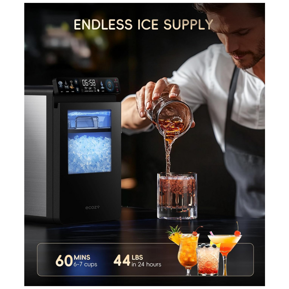 A Máquina de Gelo Nugget Ecosy IM-NS451B, em aço inoxidável, produz até 20 kg de gelo pellet macio por dia, projetada para operação contínua em cozinhas residenciais ou comerciais. O painel IceLumix full-color apresenta ícones vibrantes, monitoramento de TDS em tempo real e temperatura atual, permitindo controle preciso e visualização clara do ciclo de produção de gelo nugget.