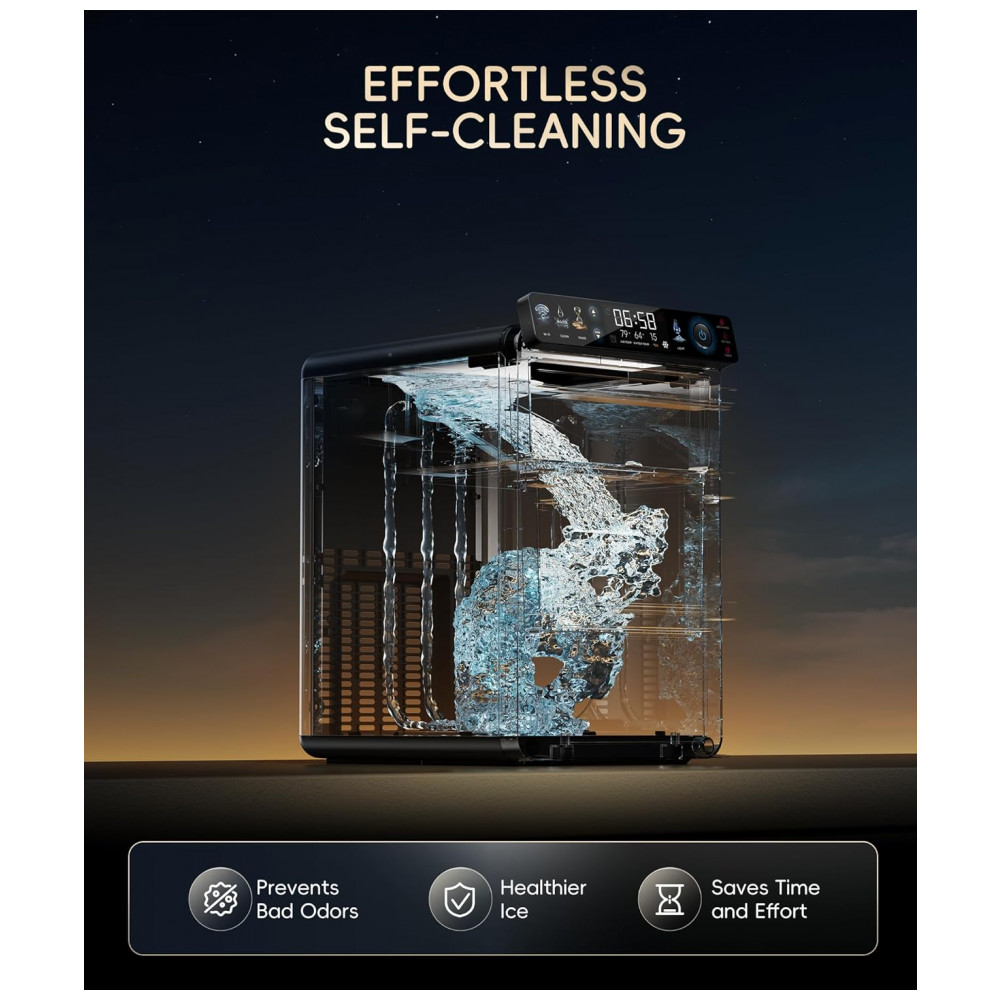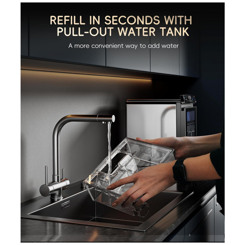 Com isolamento térmico de dupla camada, mantém o gelo 20% mais frio por mais tempo, melhorando a eficiência energética e reduzindo derretimento. O tanque de água pull-out simplifica reabastecimentos e limpezas, enquanto a cesta removível com luz LED integrada facilita a verificação rápida do nível de gelo.
