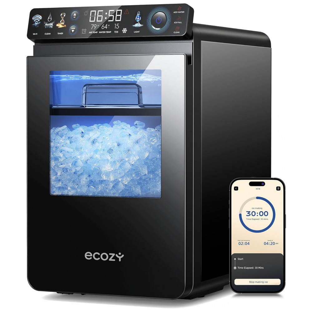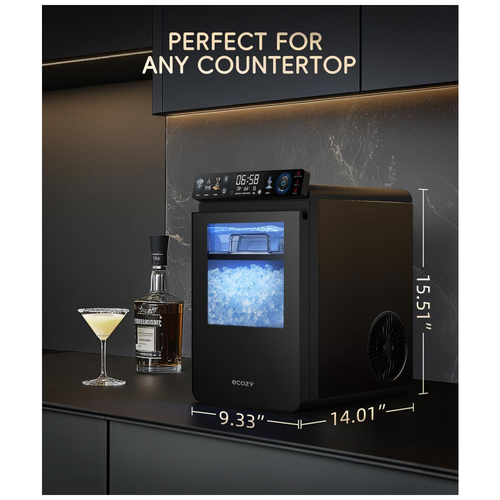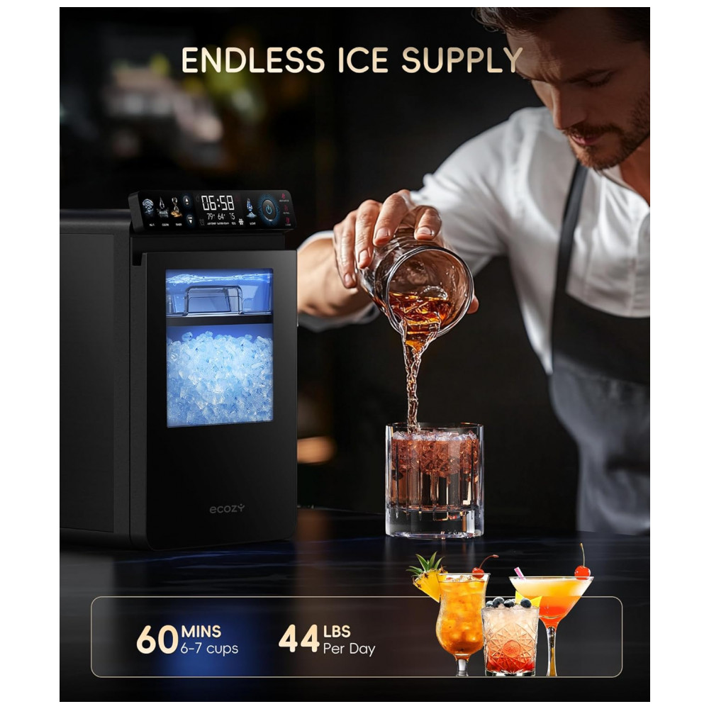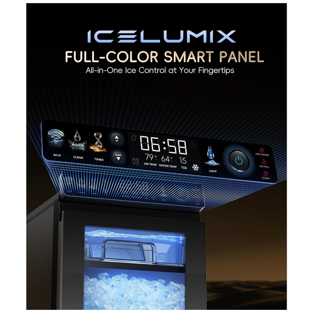 A Máquina de Gelo Nugget Ecosy IM-NS451B, na cor preta, produz até 20 kg de gelo pellet macio e mastigável por dia, ideal para uso contínuo em residências ou eventos. Equipada com painel IceLumix de tela colorida full-color, exibe ícones vibrantes, TDS em tempo real e temperatura atual para monitoramento preciso do processo de produção de gelo.