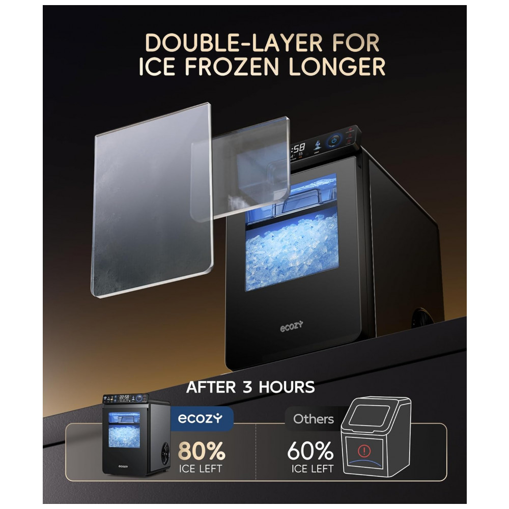 A isolamento térmico de dupla camada mantém o gelo 20% mais frio por mais tempo, otimizando a eficiência energética e reduzindo derretimento. O tanque de água removível facilita o reabastecimento e a limpeza, enquanto a cesta de gelo com luz LED integrada permite verificação rápida do nível sem esforço.