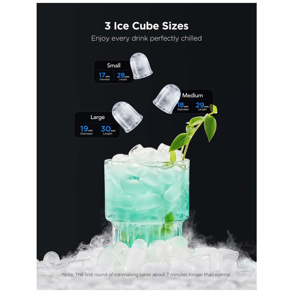 3 Tamanhos de Cubos de Gelo: Personalize o tamanho do gelo com três opções ajustáveis (pequeno, médio, grande). O gelo em forma de bala derrete lentamente e é resistente a grudar, perfeito para manter suas bebidas frescas. A máquina inclui uma cesta portátil que comporta até 680 g de gelo, oferecendo uma variedade de combinações para atender às suas necessidades.